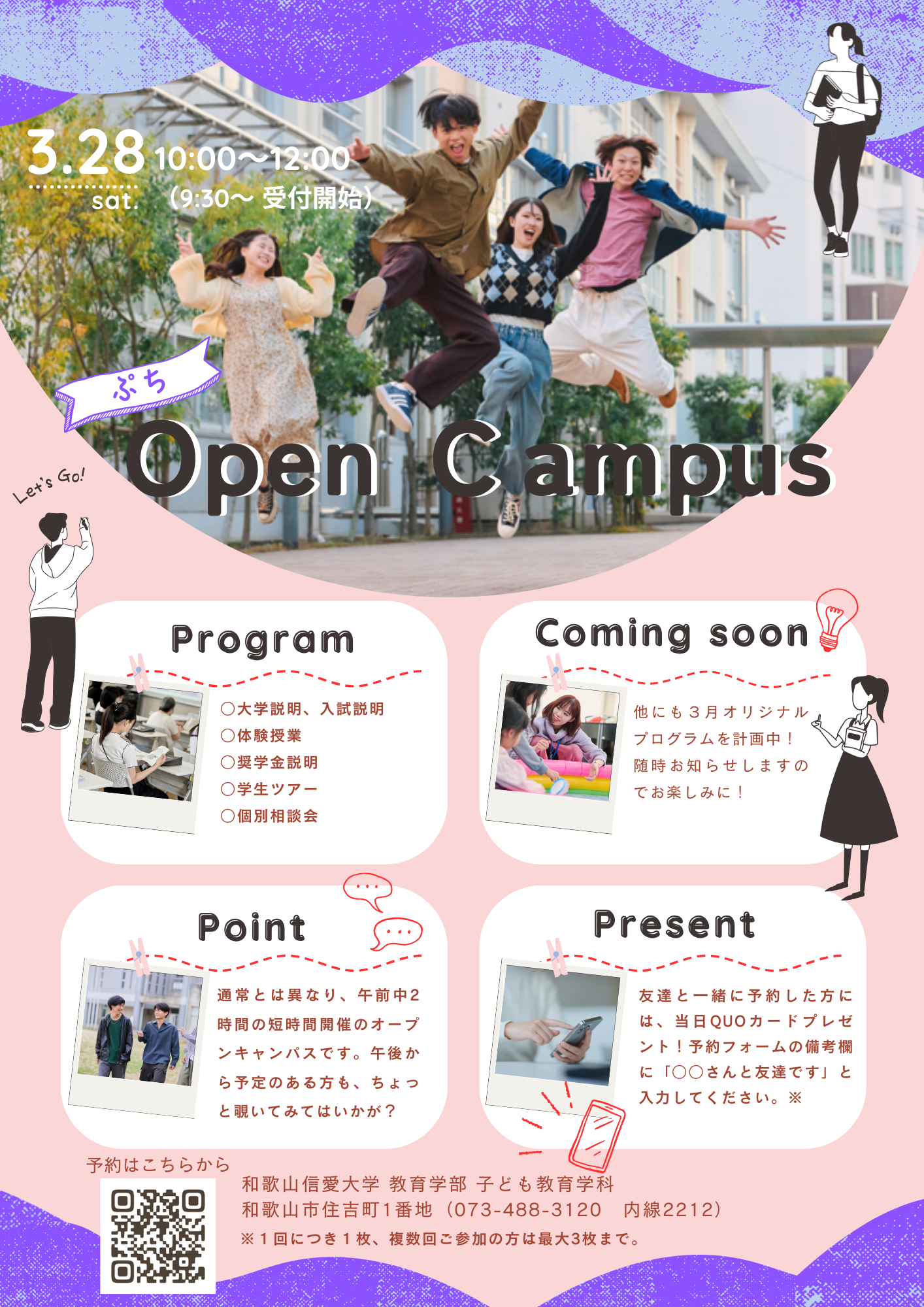 2025年5月17日(土)2025年6月21日(土)2025年7月26日(土)2025年8月23日(土)2025年9月13日(土)【総合型選抜対策講座】も実施予定!2025年12月6日(土)- 2026年3月29日(土)【春のプチオープンキャンパス】体験授業や在学生との交流も!