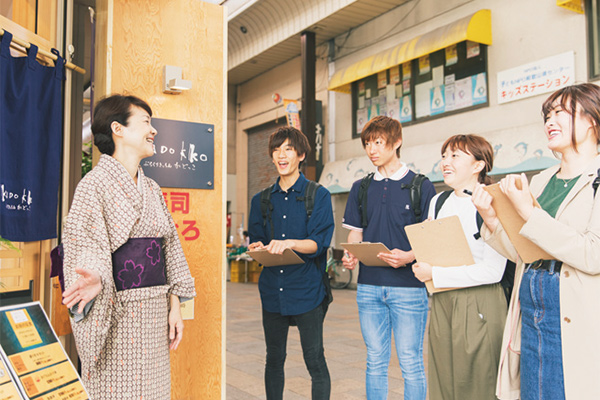 170年以上愛されてきたこの商店街に、かつての賑わいを取り戻そうと、組合や行政など、多くの団体が取り組 んでいます。和歌山信愛大学も、この取り組みに参加。立場や世代を越えた人たちと協力し合い、本格的な町おこしに挑みます。