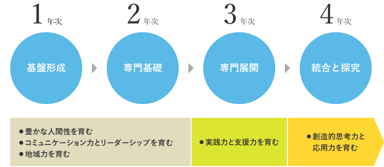1年次を教育者としての「基盤形成」、2年次を「専門基礎」、3年次を「専門展開」、4年次を「統合と探究」の時期とし、体系的に教育課程を編成しています。