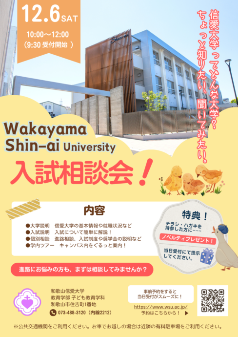 2025.11.04 イベント 12/6(土) 入試相談会・総合型選抜後期面談を実施します! 2025年12月6日(土) 開催時間/10:00~12:00 (受付時間/9:30~) 【内 容】 ・キャンパス見学会 ・個別相談(入試相談) ・過去問配布 ・総合型選抜後期(自由応募型)面談・エントリーシート配布 等 ↓ 予約はこちらから 和歌山信愛大学 OPEN CAMPUS 事前予約がおすすめです。当日参加も可能です。 予約人数の都合上、受付開始時間が異なる場合がございます。時間変更の際には、個別に電話・メールにてご連絡させていただいておりますのでご確認ください。 必要事項を入力し、送信してください。 高校生の方は、お友達と参加でも一人ずつご予約ください。(備考に○○さんと友達とご記入ください) 保護者様のみの参加も可能です。 一覧に戻る