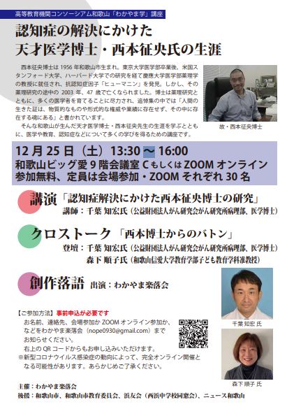 西本征(いく)央(お)医学博士は1955年和歌山市に生まれ。東京大学大学医学部、ハーバード大学医学部、慶応大学医学部と進まれ、認知症の因子ヒューマニンを発見された。しかし、その薬理研究の途中、2003年亡くなられた。西本先生は薬理研究とともに、多くの医学者を育てることに尽力された。先生の追悼集の中では「人間の生きた証は、物質的なものや形式的な権威や業績に存在せず、その中の存在する魂にある」と書かれている。そんな和歌山が生んだ天才医学博士西本征(いく)央(お)先生の生涯を学び、医学や教育、認知症などについて多くの学びを得ようとするコンソーシアムわかやま学講座。