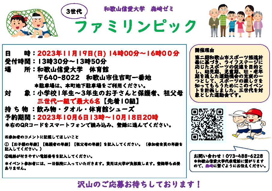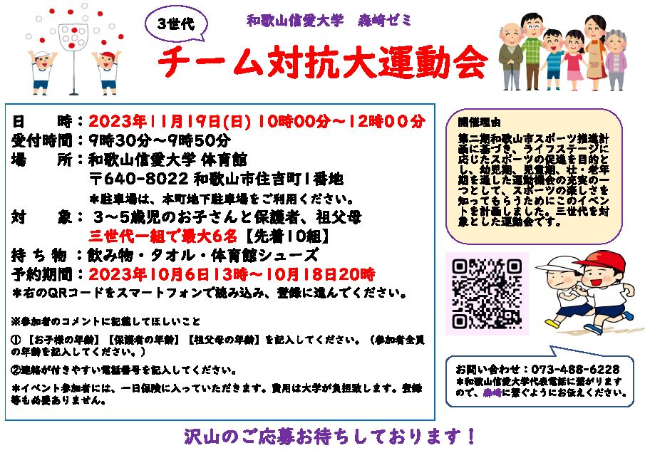 親子で運動を楽しむイベントは、和歌山信愛大学の2年生科目「地域連携フィールドゼミナール」の森﨑ゼミの学生が授業の一環として企画・運営します。詳細は、チラシをご確認の上、事前予約をお願いいたします。