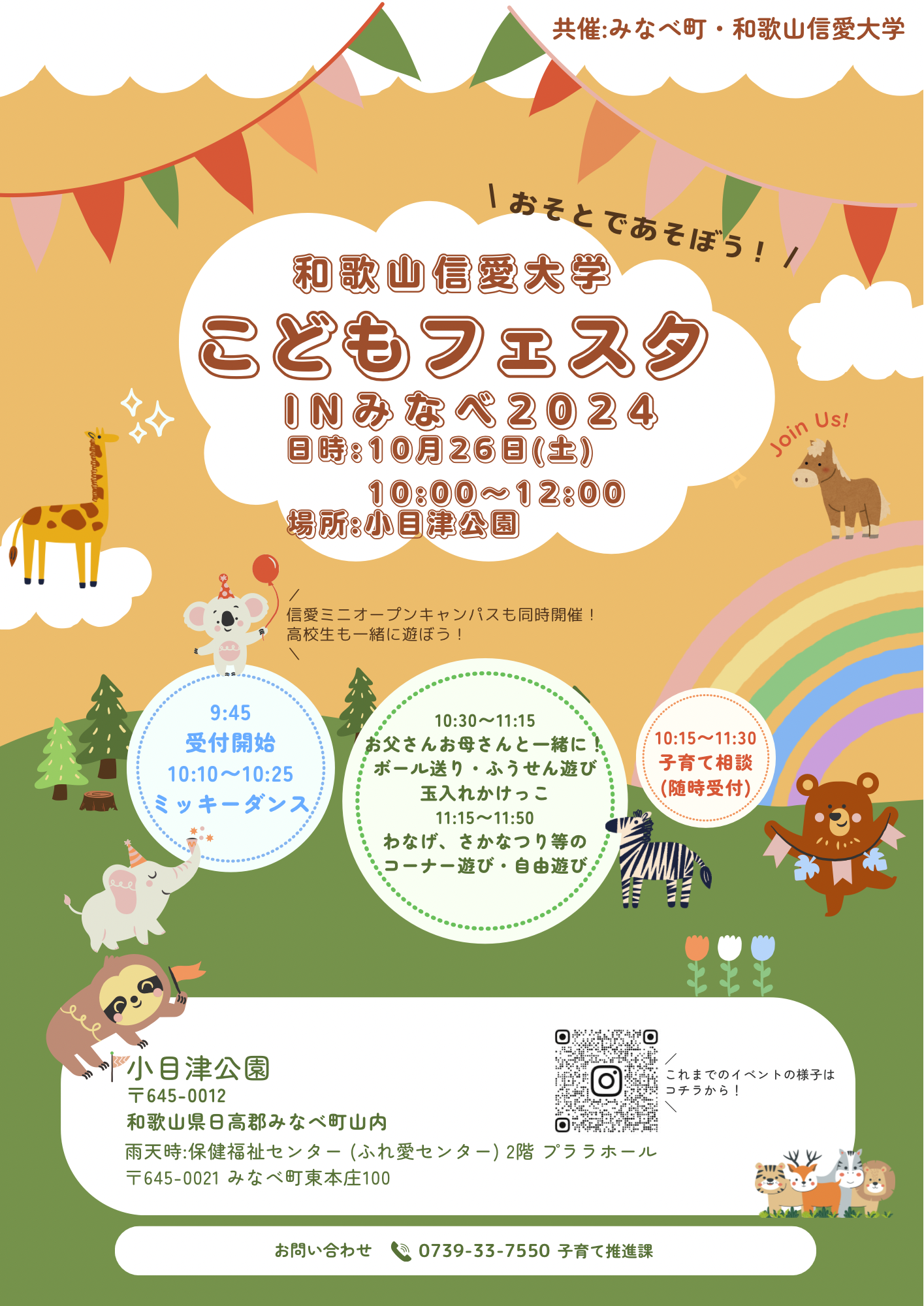 みなべ町と和歌山信愛大学の共催により「こどもフェスタINみなべ2024」を開催いたします。