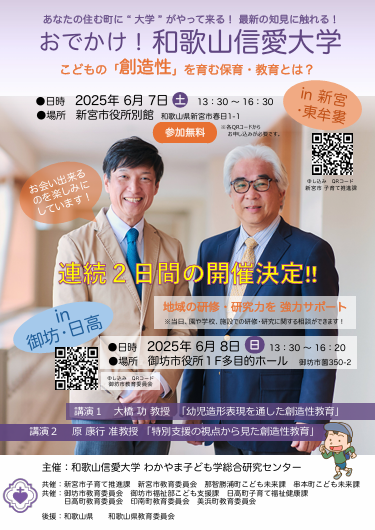 和歌山信愛大学 わかやま子ども学総合研究センターが、各自治体と共催する「おでかけ!和歌山信愛大学」が紀南地方で2日間に渡り開催されます。※詳細は上のチラシをクリックしてご確認ください。