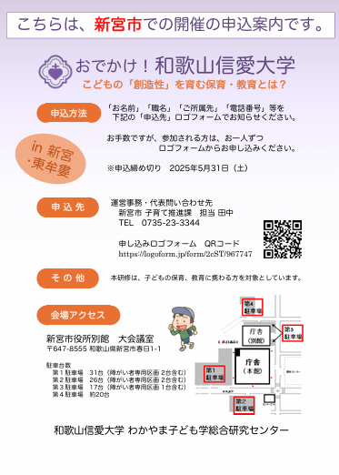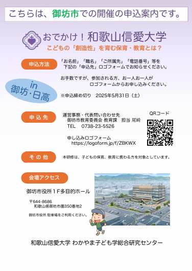 企画内容については、和歌山信愛大学 わかやま子ども学総合研究センター073-488-3120(内線2103)まで