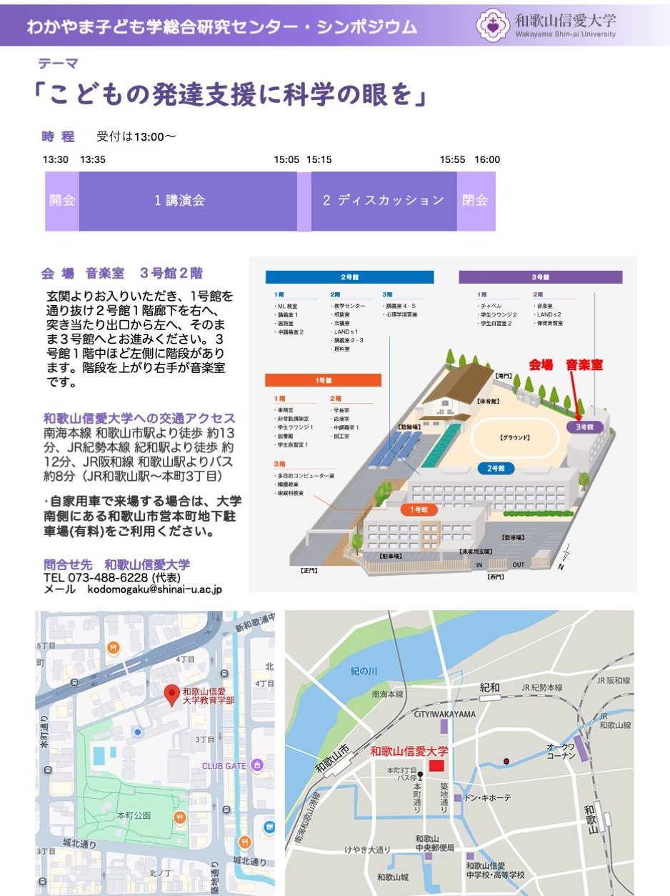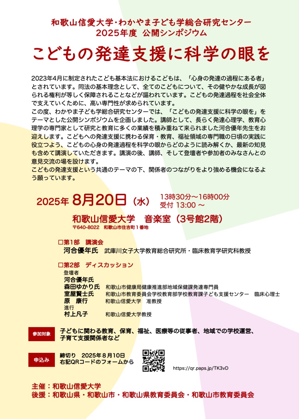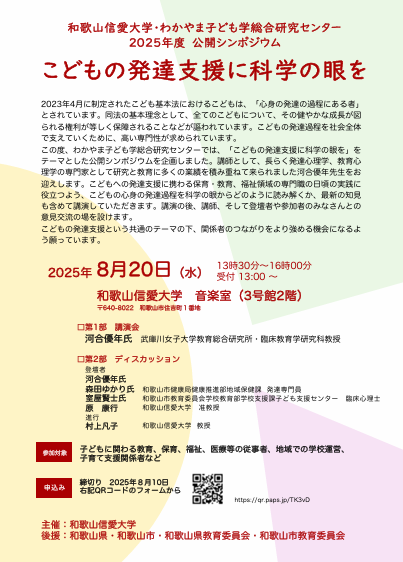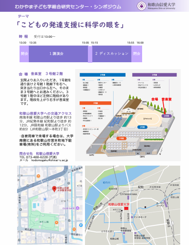 この度、わかやま子ども学総合研究センターでは、「こどもの発達支援に科学の眼を」をテーマに公開シンポジウムを開催いたします。発達心理学や教育心理学の専門家である河合優年先生を講師にお迎えし、こどもの心身の発達過程を科学の眼からどのように読み解くか、最新の知見も含めてご講演いただきます。講演後は講師・登壇者・参加者の皆様との意見交換の場もございます。皆様のご参加をお待ちしております。