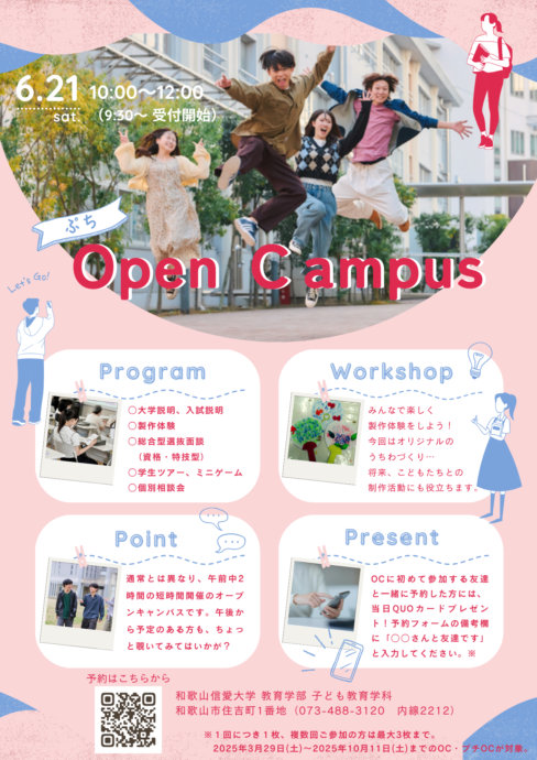 また、今年度オープンキャンパスに初めて参加するお友達と一緒に参加してくれた方には(要予約)クオカードをプレゼント。ぜひお友達もお誘いのうえ参加してください。