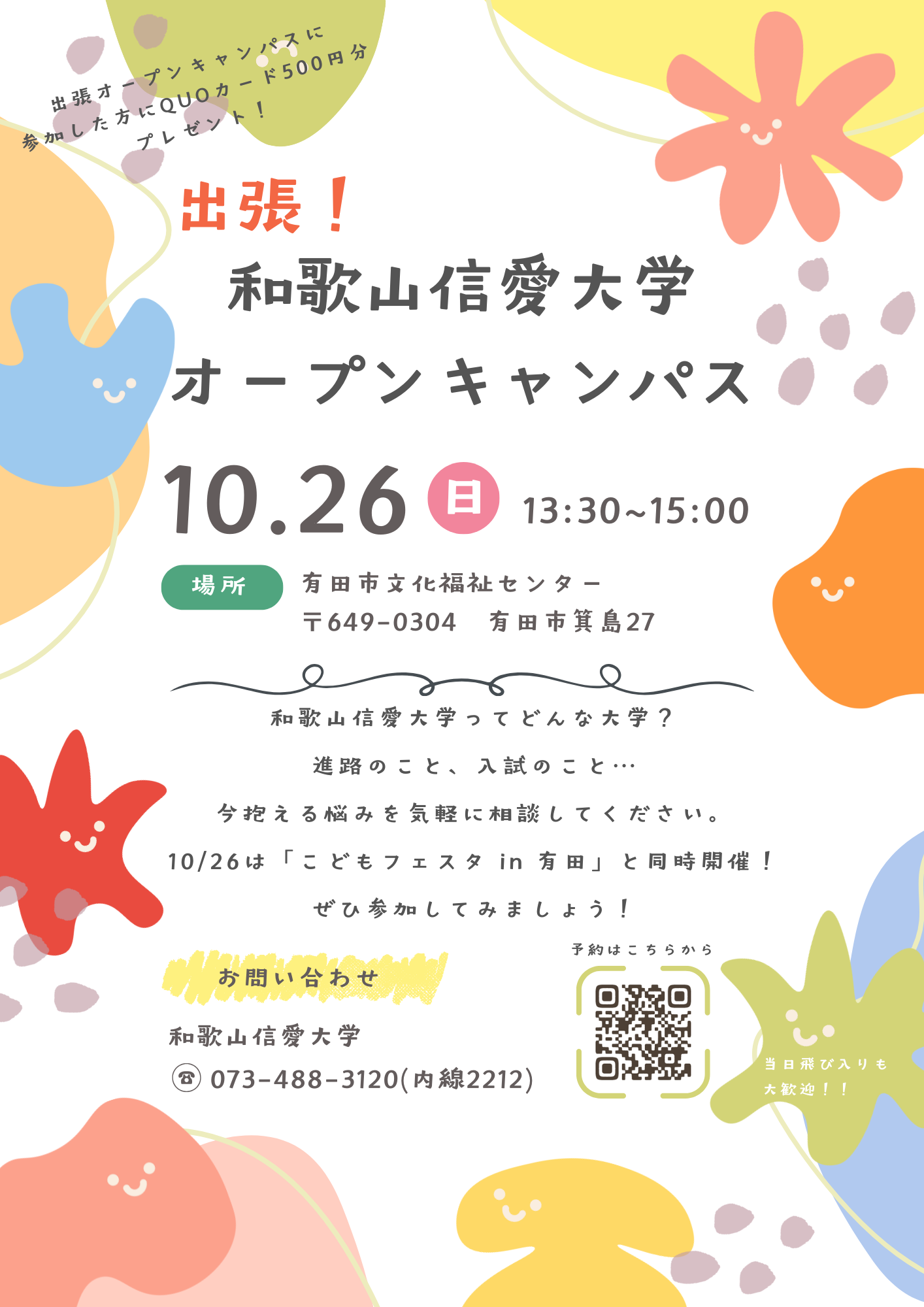 2025年10月26日(日)今回も「こどもフェスタinありだ」と同時開催で「和歌山信愛大学 出張オープンキャンパス」を実施します!