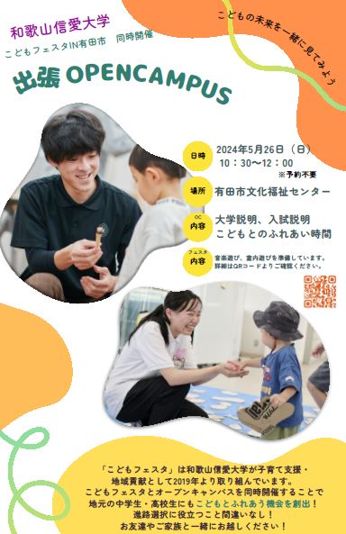 第1回目の日程は5月26日(日)10:30~12:00、場所は有田市文化福祉センターです(予約不要)。「大学のオープンキャンパスに行くのが遠い」や「部活動で日程が合わない」などのお声をいただき、出張オープンキャンパスを決定。大学説明と入試説明を個別で行います(保護者様のみも可)。
