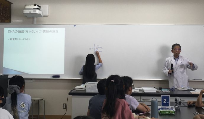 2024年10月20日(日)に和歌山信愛大学にて、「島ものづくり塾」第3回講義が開催されました。「島ものづくり塾」は、公益財団法人・島財団により2019年から開塾され、今年度で6年目となります。小学生を対象に、科学技術の不思議さ、楽しさ及び素晴らしさを体感し、科学技術に対する好奇心や関心が育つような講義・実験等を実施しています。10月20日(日)の第3回講義では、本学の秋吉博之教授が講師を担当しました。「DNAの科学」と題し、植物からDNAを抽出する実験に取り組みました。参加した小学生の皆さんは、試料に適切な処理を施し、薬品を加えた後の変化を観察しました。また、この日の講義には、本学の秋吉ゼミ学生や有志ボランティア学生も助手として参加しました。一生懸命に実験に取り組む小学生をサポートし、日々の研究、ボランティア活動への意欲及び将来の進路にも繋がる糧とすることができました。