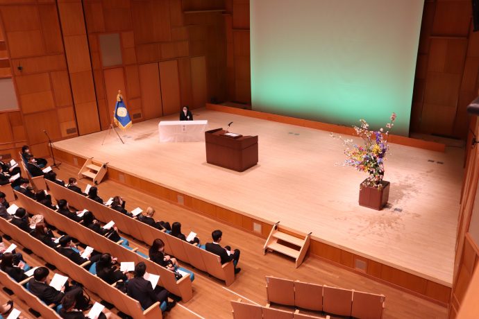 森田登志子学長は、「『一つの心、一つの魂』をモットーに、大学生として成人として大きく成長し、社会のリーダーとなって活躍できるように期待する」と式辞を述べました。