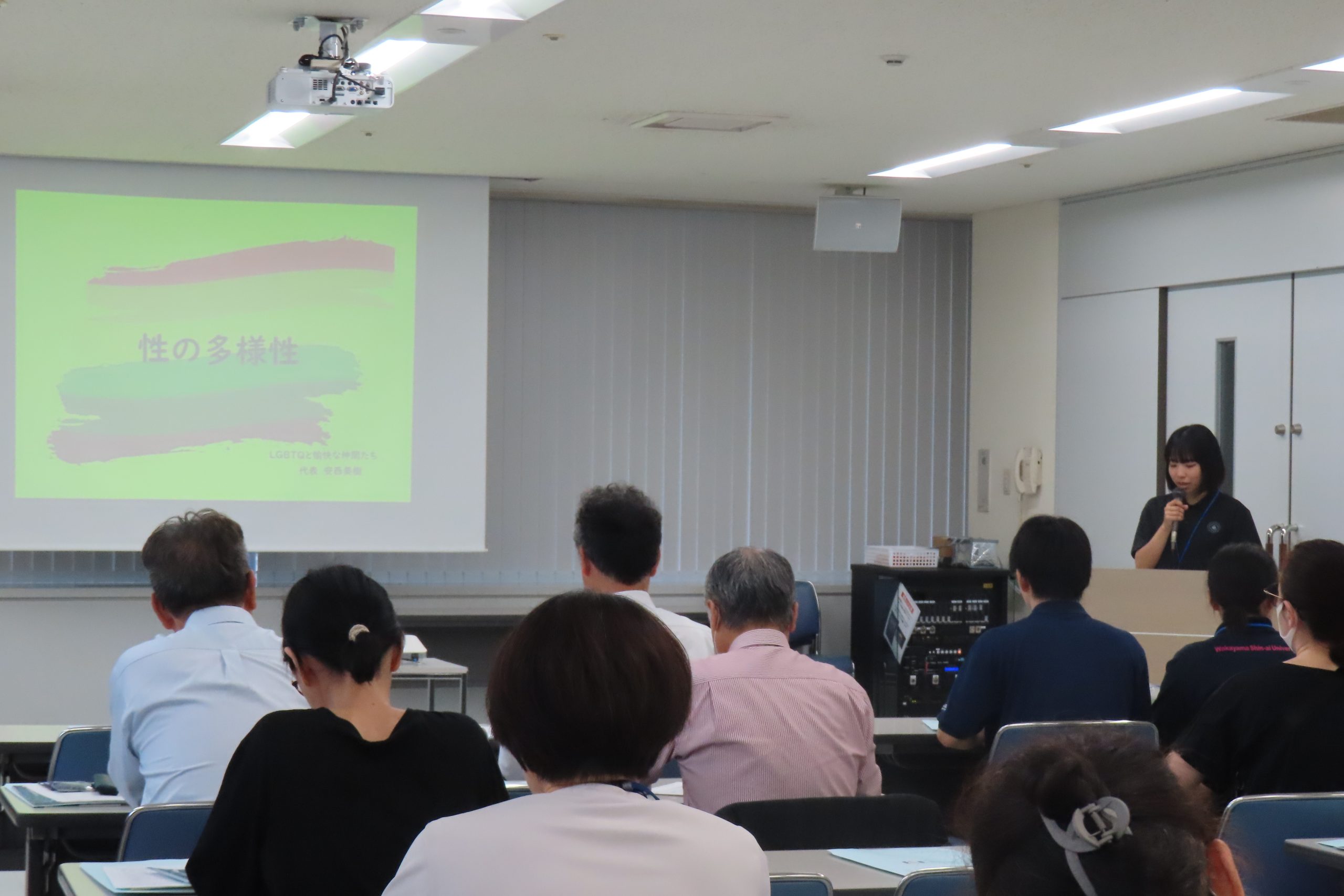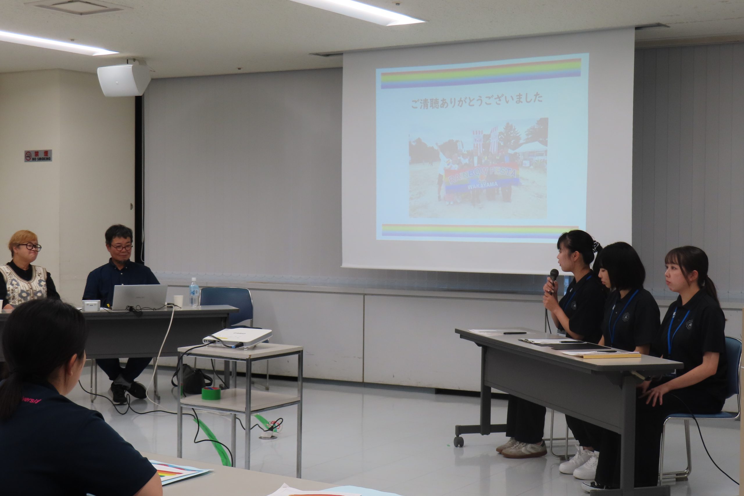 2024年10月19日(土)、県民交流プラザ和歌山ビッグ愛8階会議室にて、和歌山県や(公財)和歌山県人権啓発センターとの共催事業として、大学生主体による人権啓発イベント「性のあり方はグラデーション~パートナーシップ宣誓制度~」が開催されました。前回の人権啓発イベントに引き続き、村上凡子教授のゼミ生と原康行准教授のゼミ生を中心に、学生が主体的に企画運営した本イベントは、約30名の方が参加しました。