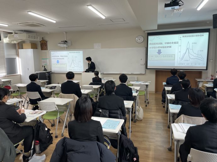 2022年12月6日(火)和歌山県教育委員会の方をお招きし、『令和6年度和歌山県公立学校教員採用候補者選考試験』を受験予定の3年生の学生を対象に本学にて説明会を実施していただきました。