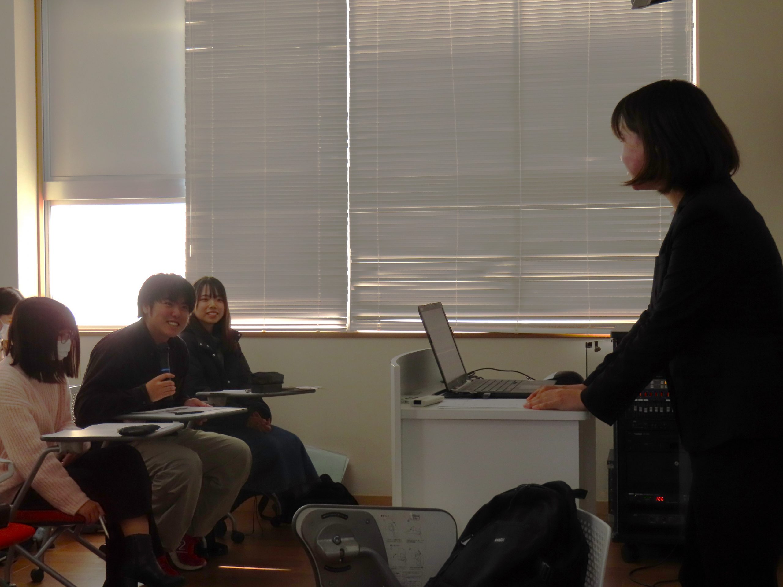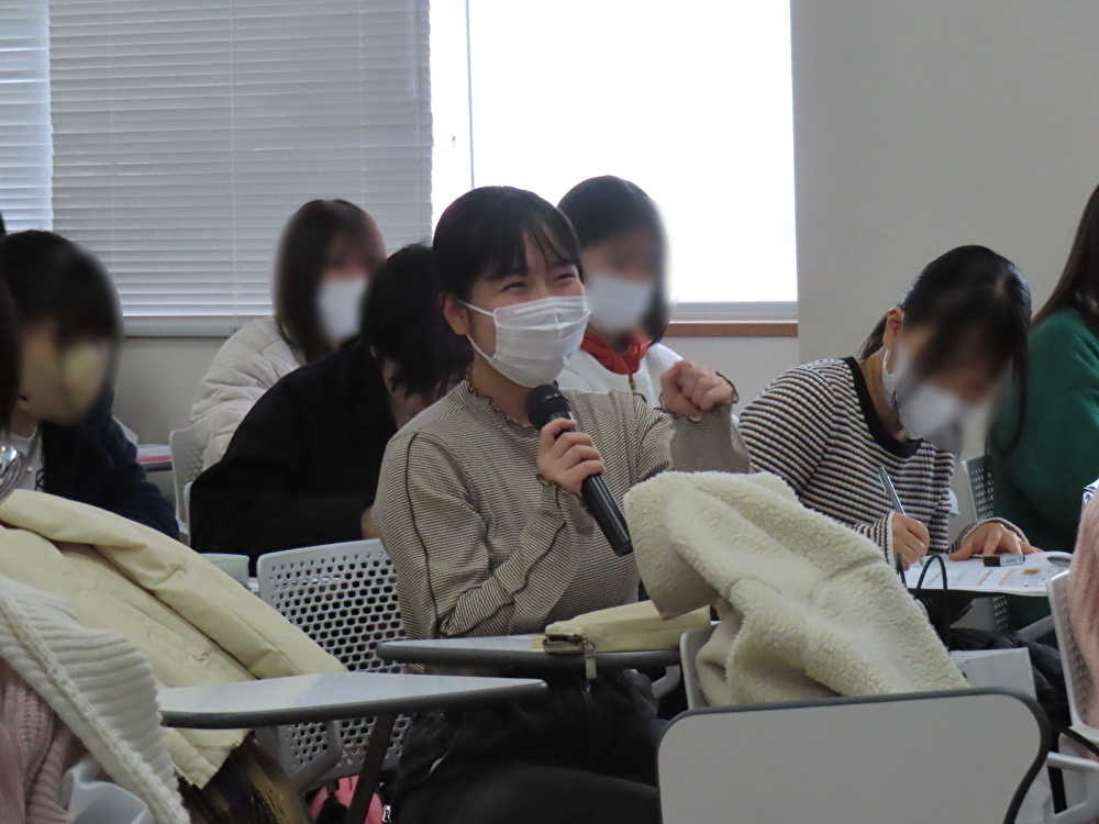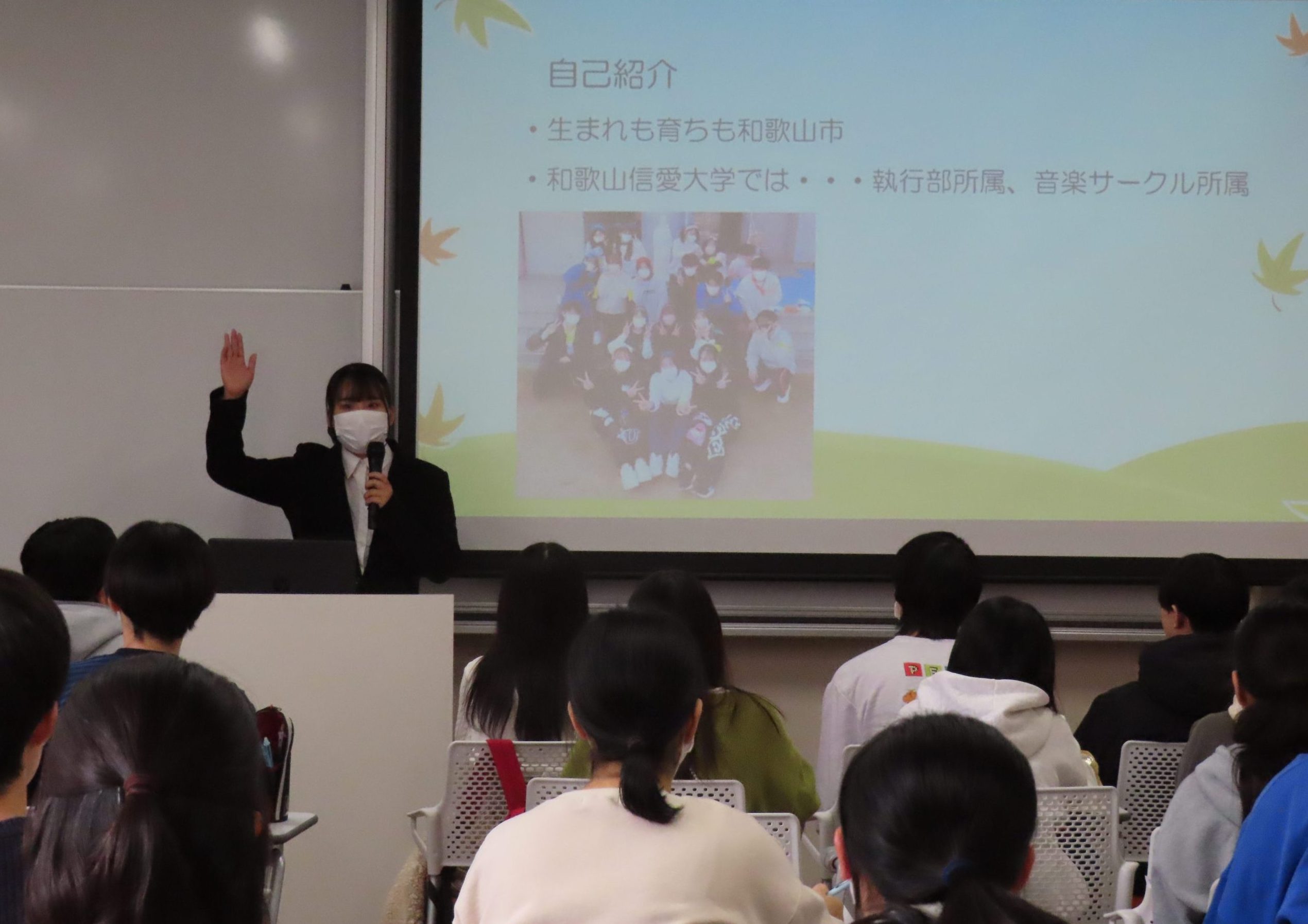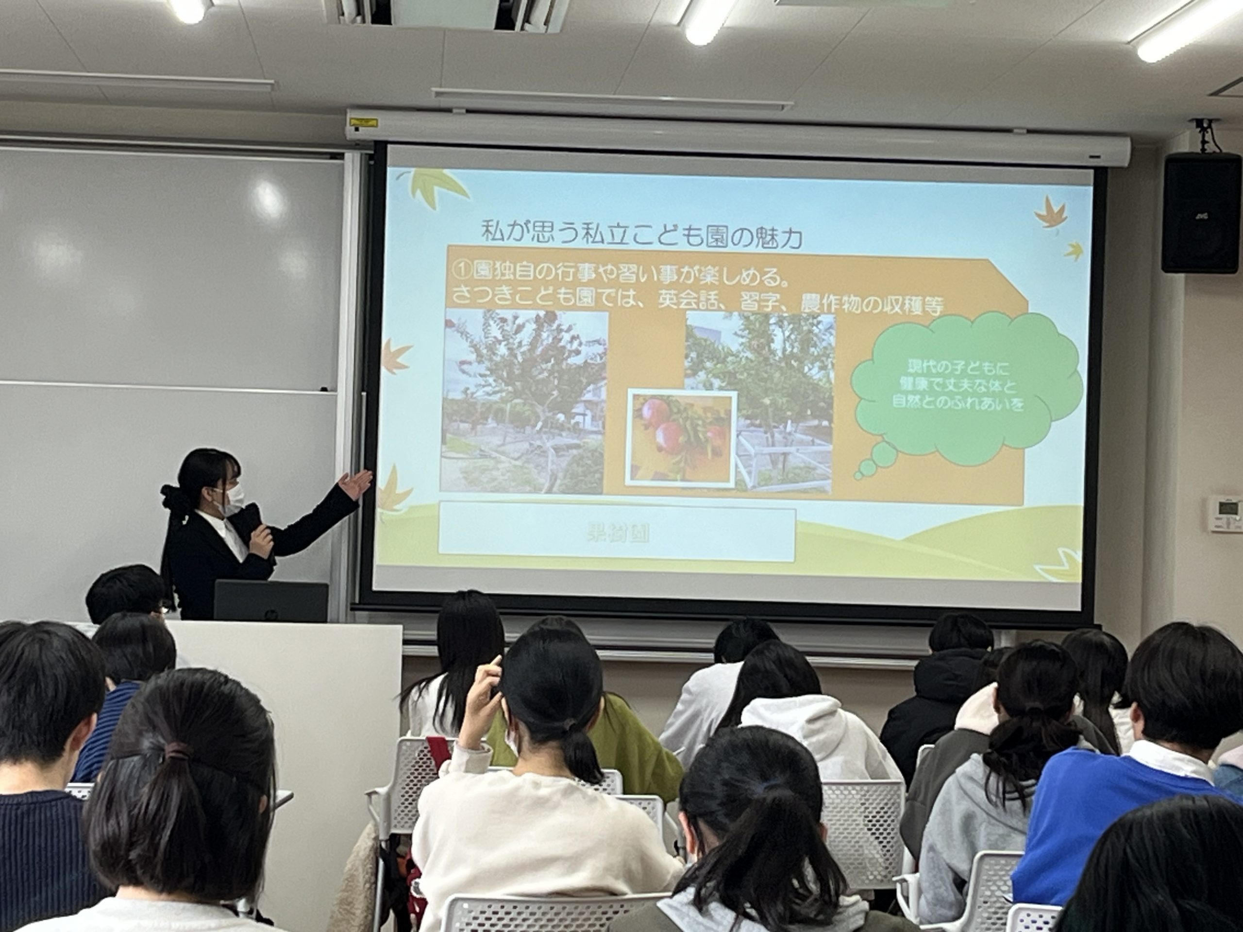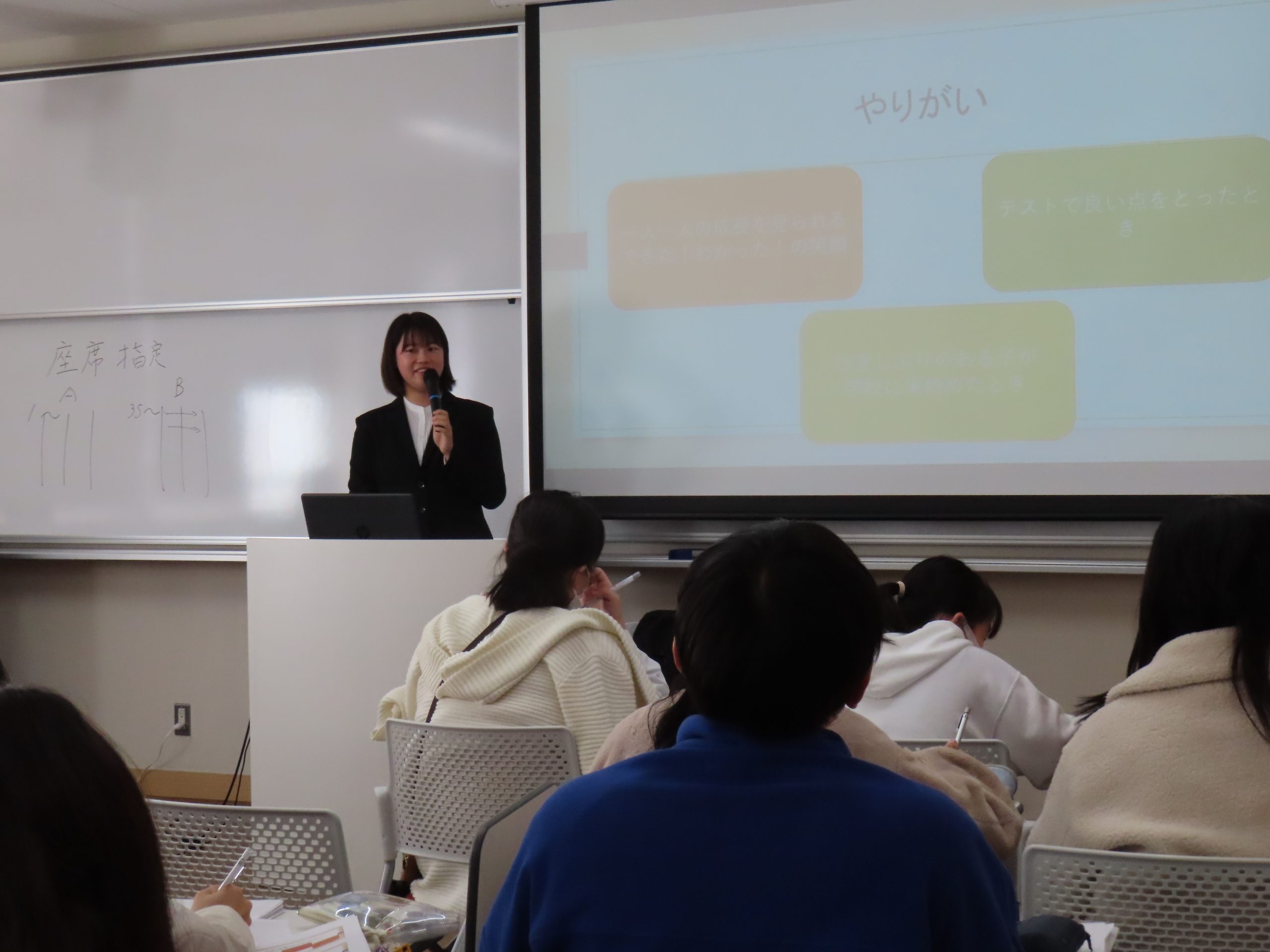 令和5年11月13日(月)では社会福祉法人さつき福祉会 さつきこども園から宮田理世先生、令和5年11月20日(月)では湯浅町立湯浅小学校から柏田詩乃先生をお招きし、1年生対象の「教職キャリアデザイン」で講義を行って頂きました。「教育者としてのやりがい」や、「1年生からやるべきこと」など、学生にとって大変有意義なお話をして下さいました。先輩からの講義であることもあり、積極的に質問をする学生の姿も多く見受けられ、実際の教育現場を知る良い機会となりました。お忙しい中ご協力頂きましたお二方、ありがとうございました。