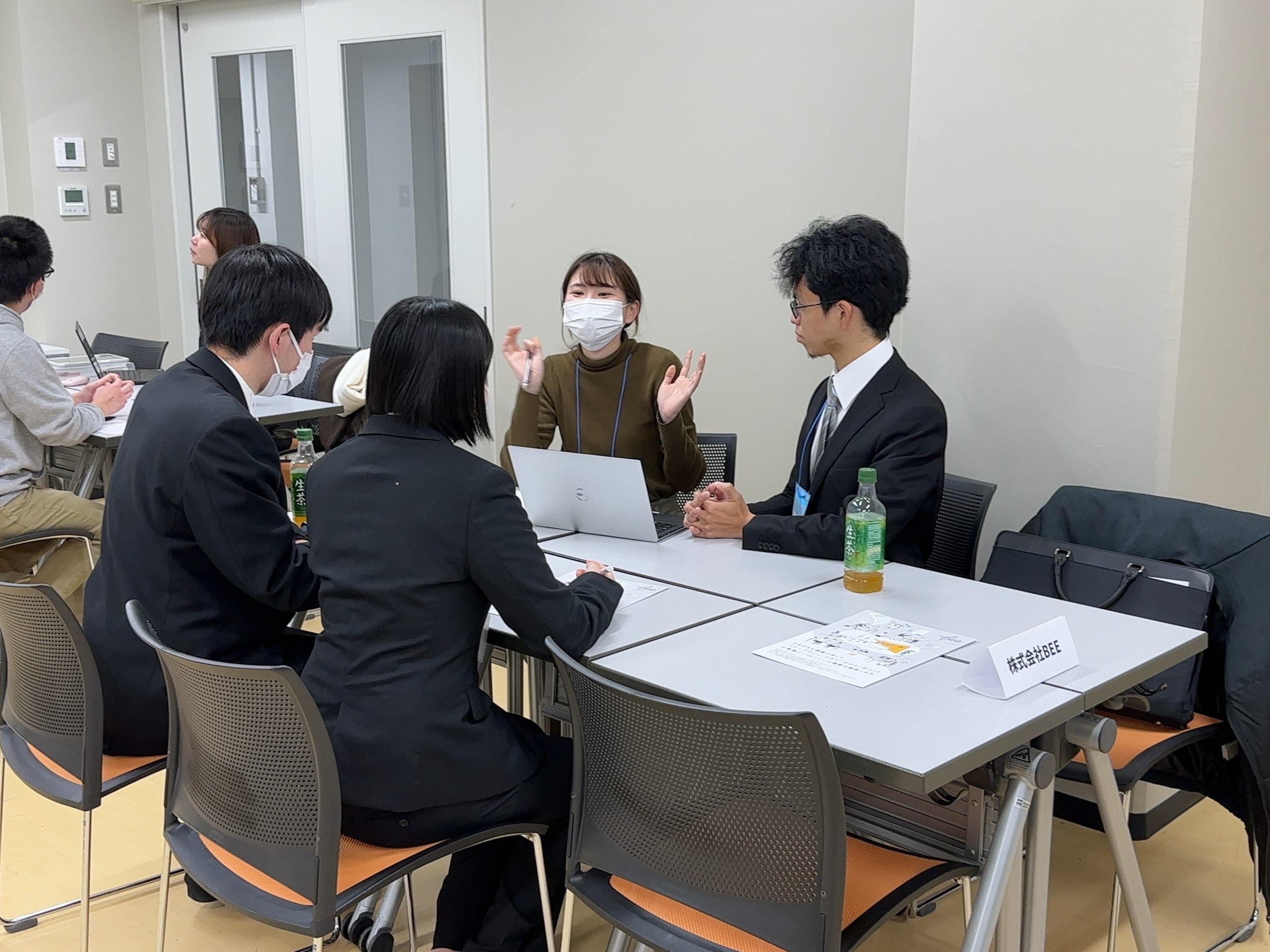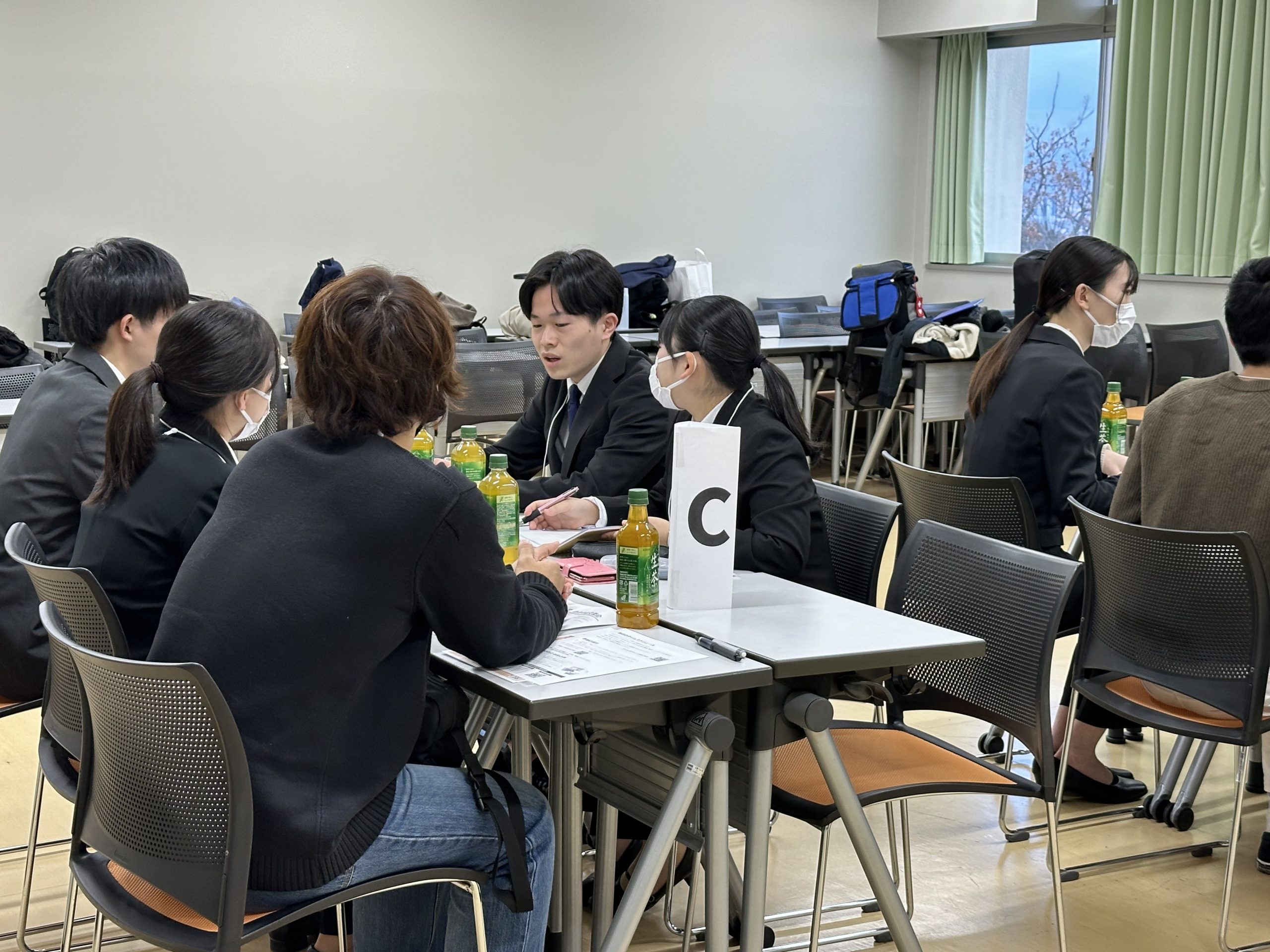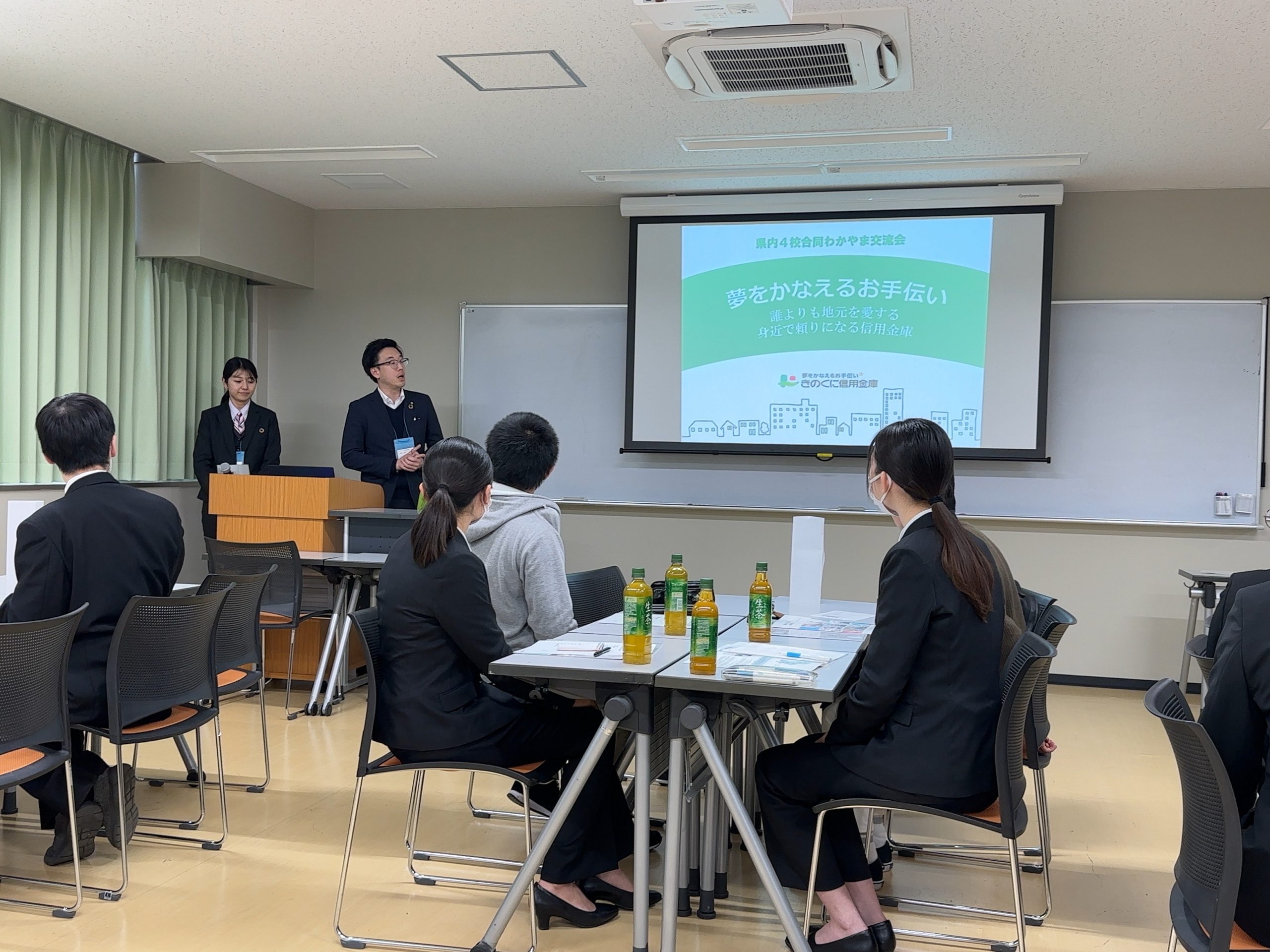 令和6年1月23日(火)和歌山県労働政策課、和歌山大学、近畿大学、和歌山信愛女子短期大学、和歌山信愛大学主催の「県内 4 校合同 わかやま交流会」が和歌山大学にて開催されました。和歌山信愛大学からは6名の学生が参加し、学生同士の情報交換や、企業の人事担当者との交流を積極的に行いました。企業の中には本学の卒業生の姿も見られ、参加学生も熱心に説明を聞き取り、質問していました。学生にとって、現場で働く職員の話を伺い、企業へのイメージを固める良い機会となりました。