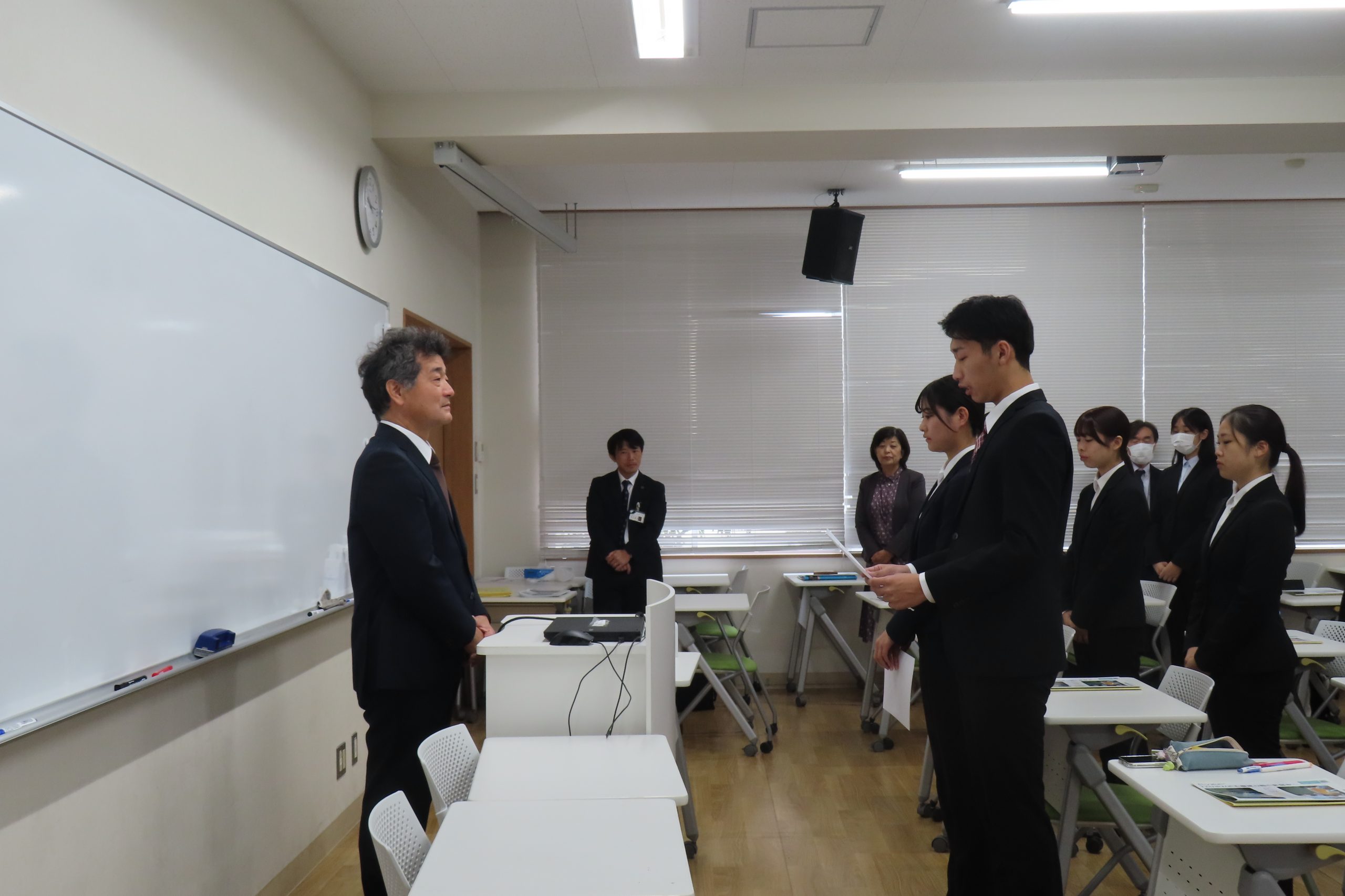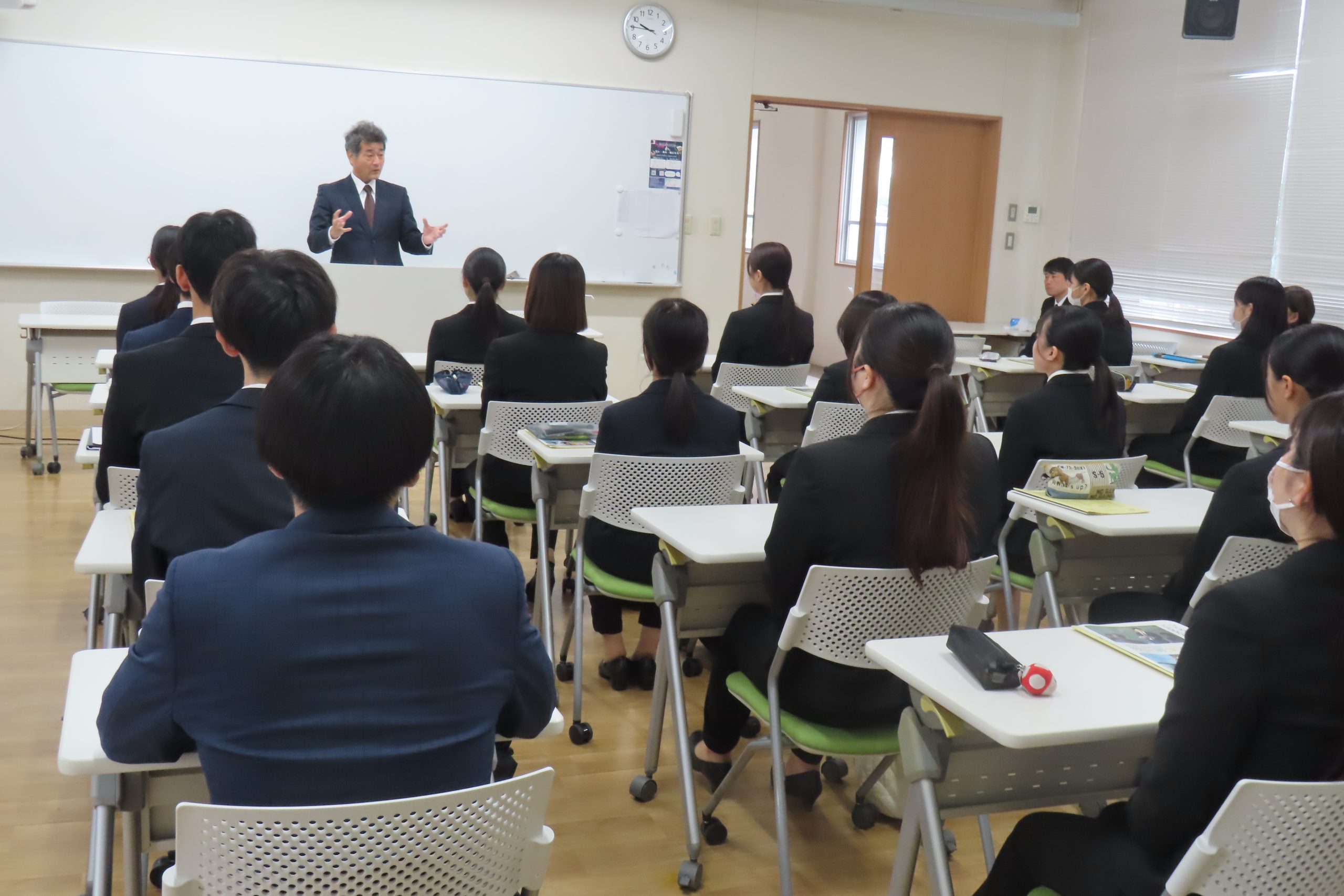 2024年10月22日(火)、令和8年度教員採用試験を受験予定の3年生を対象に、教員採用試験受験予定者結団式を実施しました。教員採用試験の早期化が予想される中、例年より1ヶ月早い実施となりました。結団式の前には、和歌山県教育委員会の方から和歌山県の求める人物像や、和歌山県の教員採用試験の状況などを説明していただきました。結団式では、大山副学長より激励の言葉が贈られ、学生代表の谷口 一華さん、西川 颯人さんの2名から受験への決意表明が述べられました。