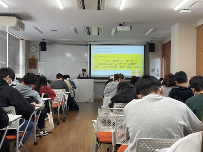 12月9日(月)、1年生対象の授業「教職キャリアデザイン」で学校法人さくら学園 さくら幼稚園から本学の卒業生、尾﨑 咲来先生をお招きし、講義を行っていただきました。自身の経験から、「学生時代にしておいた方が良いこと」や「幼稚園教諭に求められる力」について丁寧にお話しいただき、学生も身近な先輩のお話を真剣に聞き取っていました。尾﨑先生は、社会人1年目で苦労することもありますが、こどもの笑顔に癒され、充実した毎日を過ごしておられるようでした。1年生のみなさんも先輩方の姿を模範にし、様々な人と関わり、新しいことに挑戦し、悔いのない学生生活を送ってください。