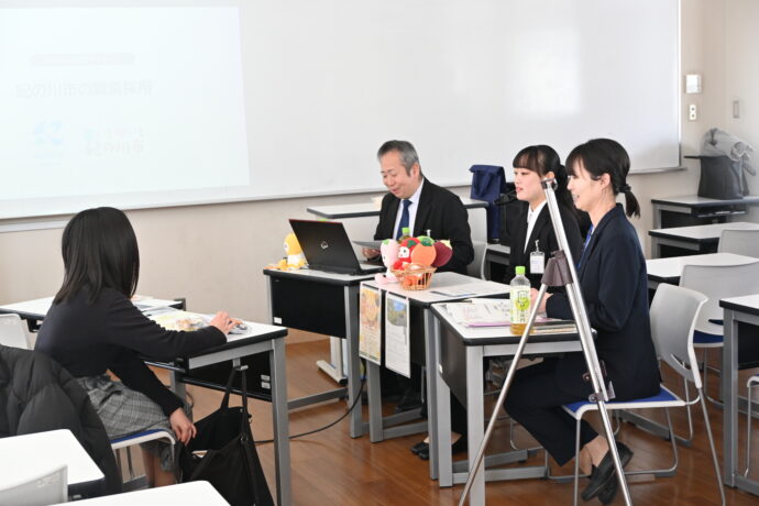 4日は和歌山市、6日は紀の川市と橋本市の職員採用説明会が行われ、一般行政職と保育士の採用について進路希望ごとにわかれて丁寧に説明いただきました。