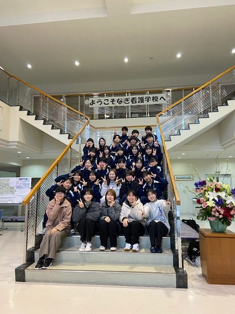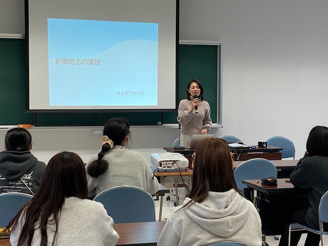 2025年3月4日、3月5日の2日間、令和6年度「きのくに活性化センター紀南地域学生プロジェクト」の助成を受けて、サークルわかまなび6名の学生が、新宮市にある和歌山県立なぎ看護高等学校へ訪問しました。2年生23名との交流をはじめ、かづこ助産院のもとだて先生による「紀南地域の子育ての現状とこれから~看護師と保育士に期待すること」の講話をお聞きし、グループワークで医療と保育の双方から議論を行いました。また、2日目には「子育てひろば」を共同で開催しました。地域の親子5組にご参加いただき楽しんでいただきました。和歌山の紀北と紀南の交流が今後も深まることを期待します。
