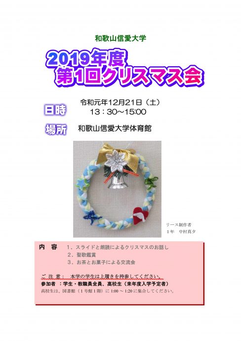 2019.12.05 キャンパスライフ 【学内行事】第1回クリスマス会を開催します。 建学の精神・キリストの教えに従って、学生一人ひとりが 生命と人格を尊重しその能力の全面的開花・発展を目指しています。 本学では2019年12月21日(土) にクリスマス会を行います。 一覧に戻る