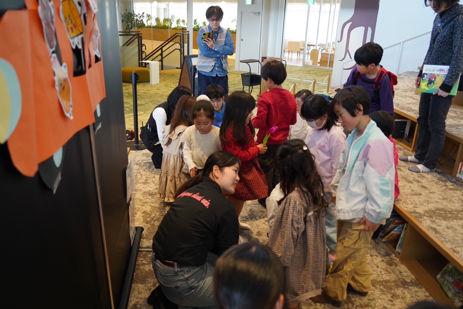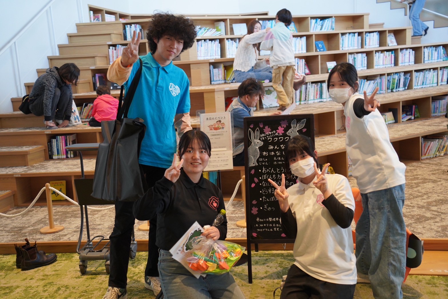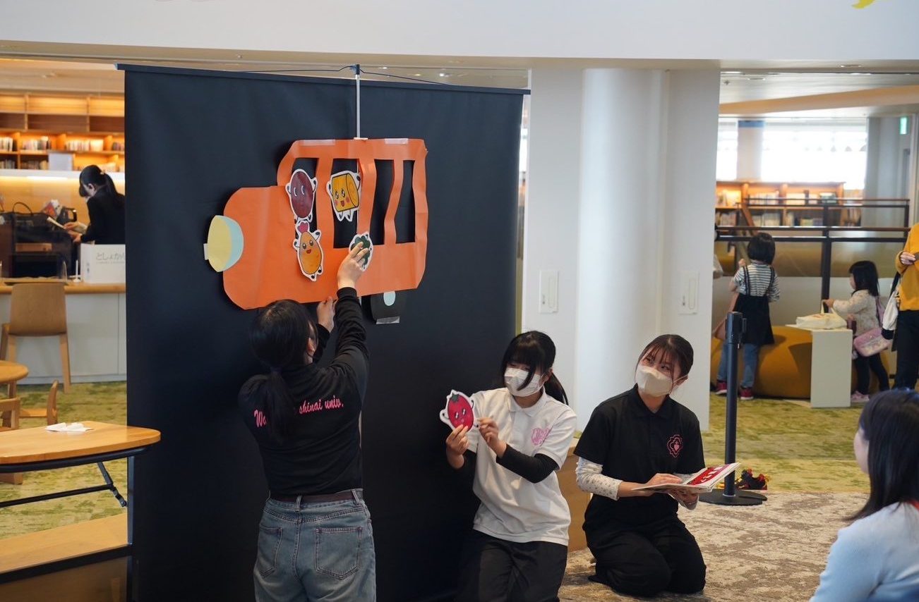 2025年3月22日(土)に、和歌山市民図書館主催の「ワクワクみんなのおはなし会」で、本学のサークル「子育て支援キャラバン隊」のメンバー5名が、ホワイトボードシアター、手遊び、読み聞かせにチャレンジさせていただきました。子どもたちが熱心に聞いてくれ、笑顔で楽しんでくれている様子をみて、私たちも楽しんで読み聞かせを行うことができました。これまでも数回読み聞かせにチャレンジしてきましたが、今回の経験を通して、自己成長を感じることができました。これからも頑張っていきたいと思います。ありがとうございました。