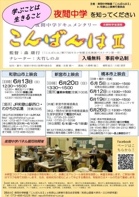 本学が後援し、本学の江口怜助教が事務局長を務める夜間中学ドキュメンタリー映画「こんばんはⅡ」の上映会が、6月に和歌山市・橋本市・新宮市で開催されます。