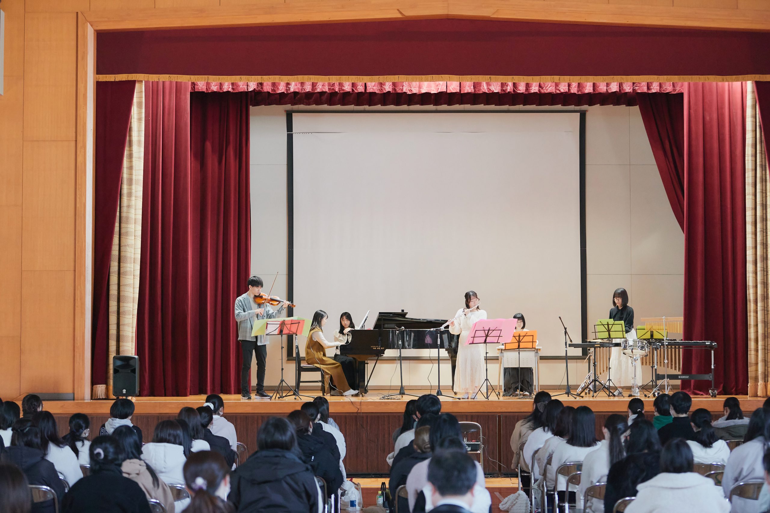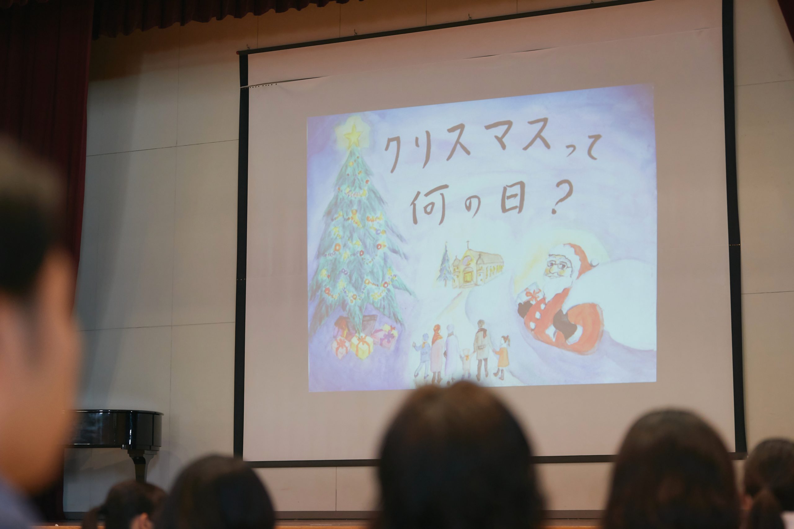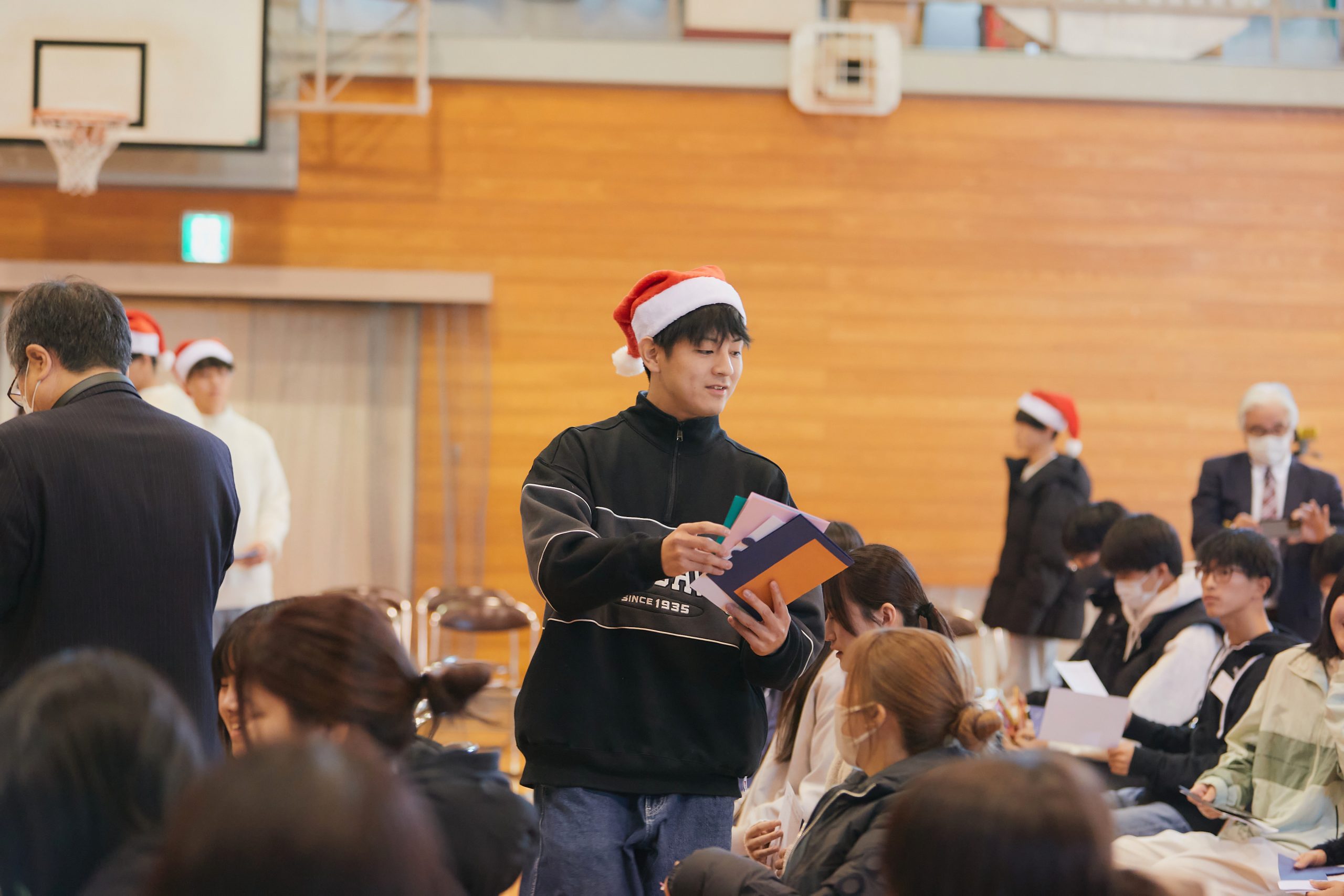 2023年12月9日、本学体育館にて「クリスマスのつどい」がおこなわれました。1年生全員が出席し、同日開催していた2024年度入学予定の高校生の皆さんをお招きして、①スライドショー「クリスマスって何の日」②2~4年生有志による音楽演奏③2年生制作のクリスマスカードのプレゼント等が実施されました。「一つの心、一つの魂」の精神を深く体験し、世界中の方々が”ほっとしたクリスマス”を迎えられますようお祈りする素敵なつどいとなりました。