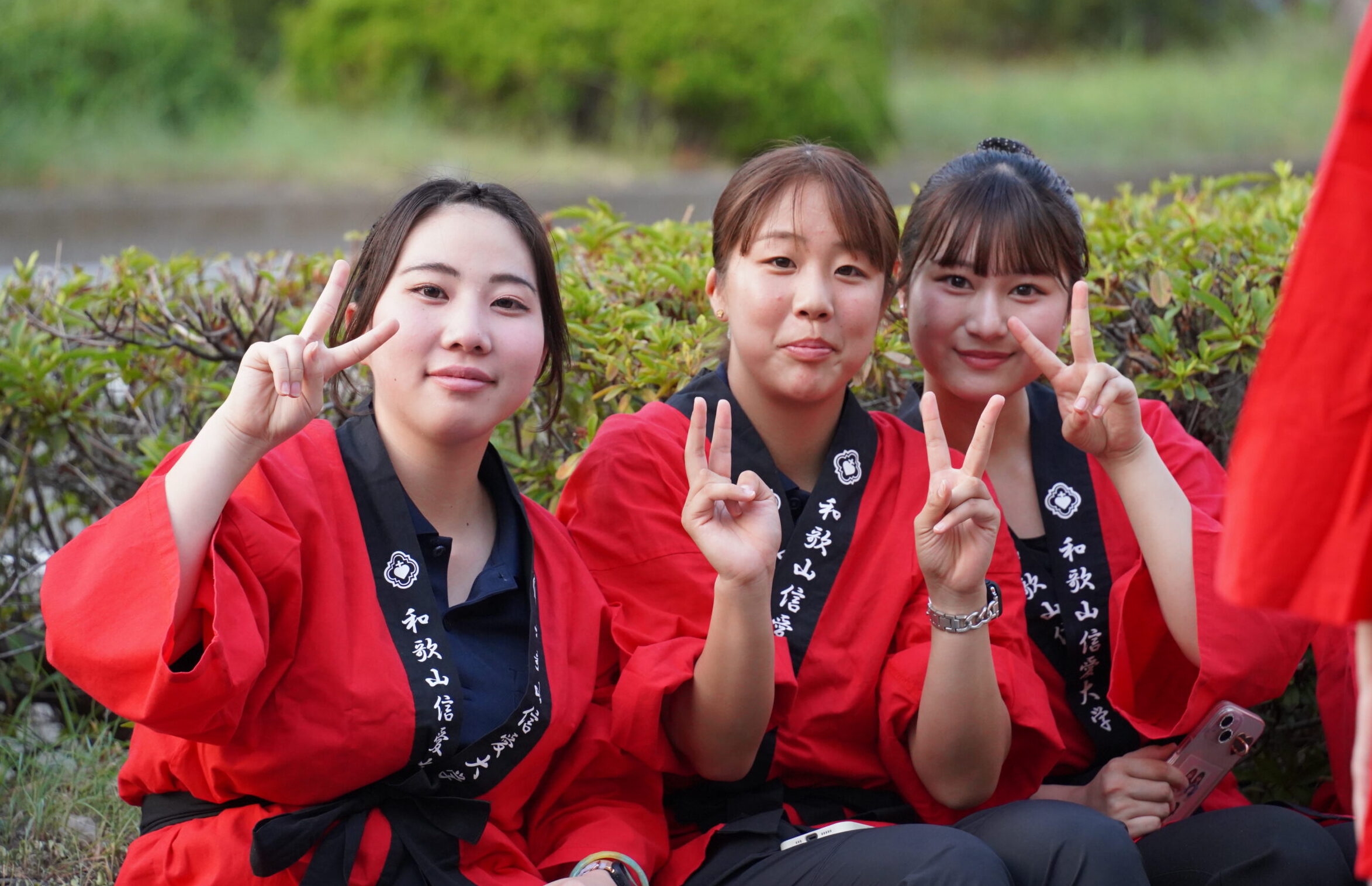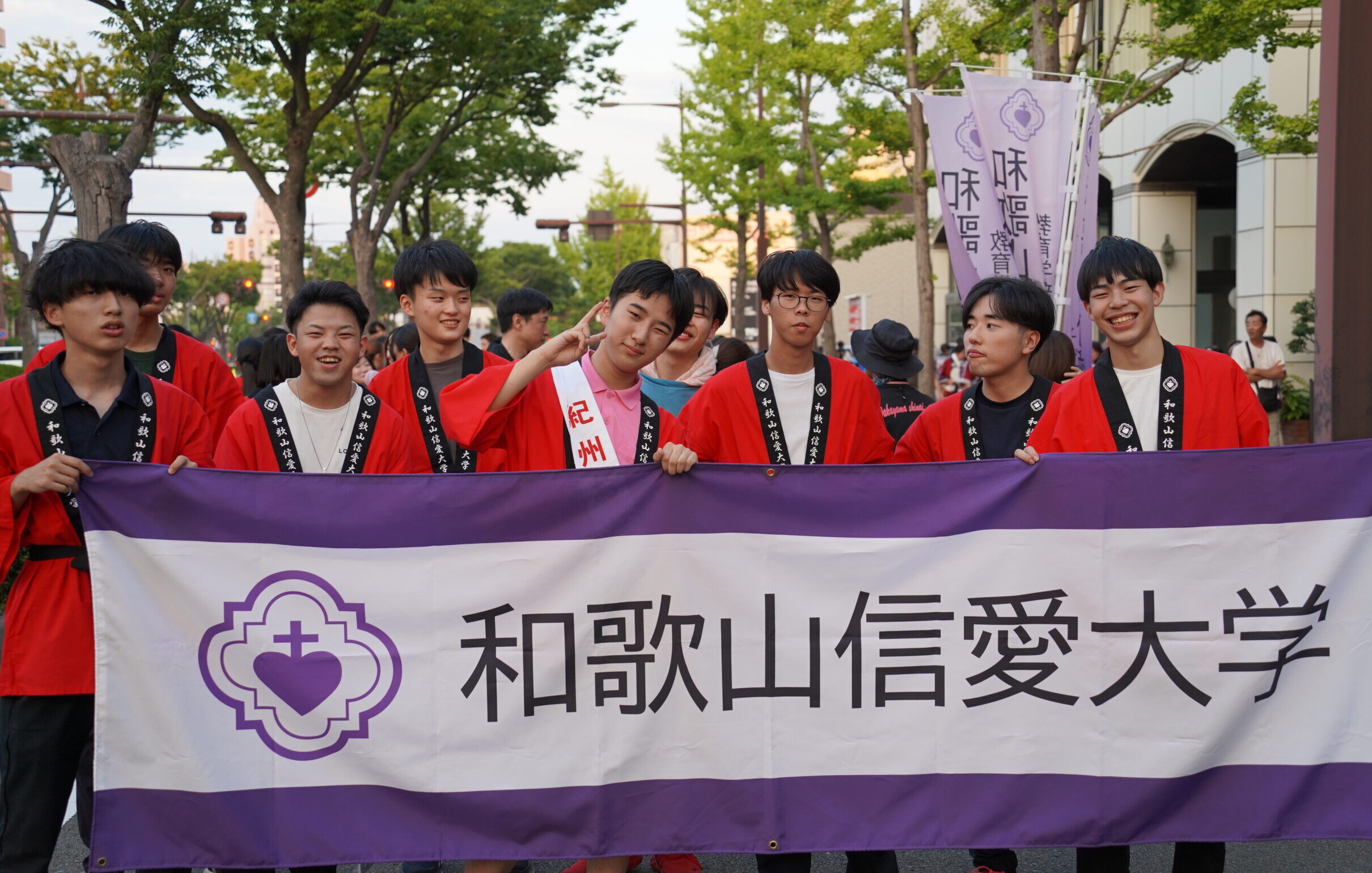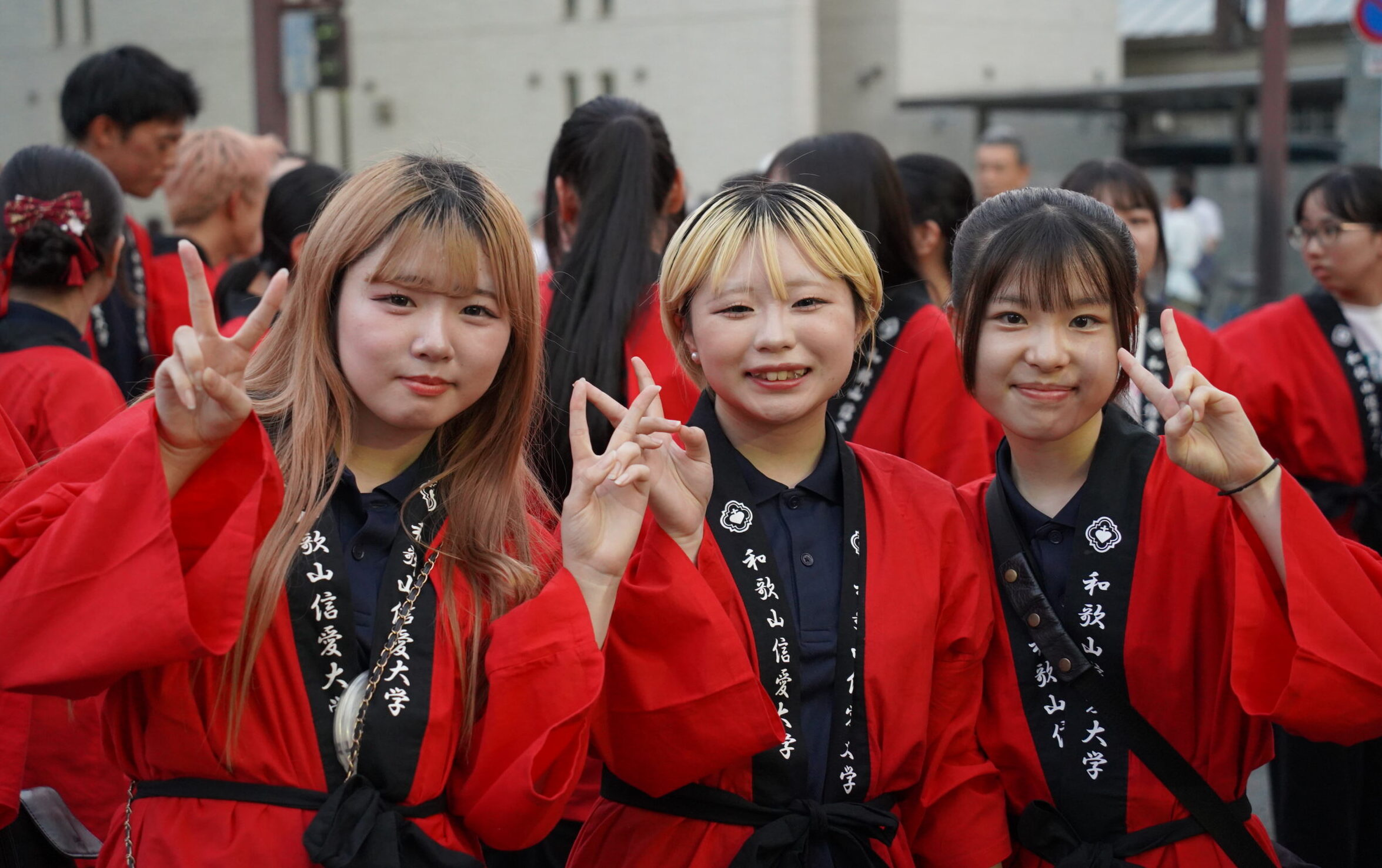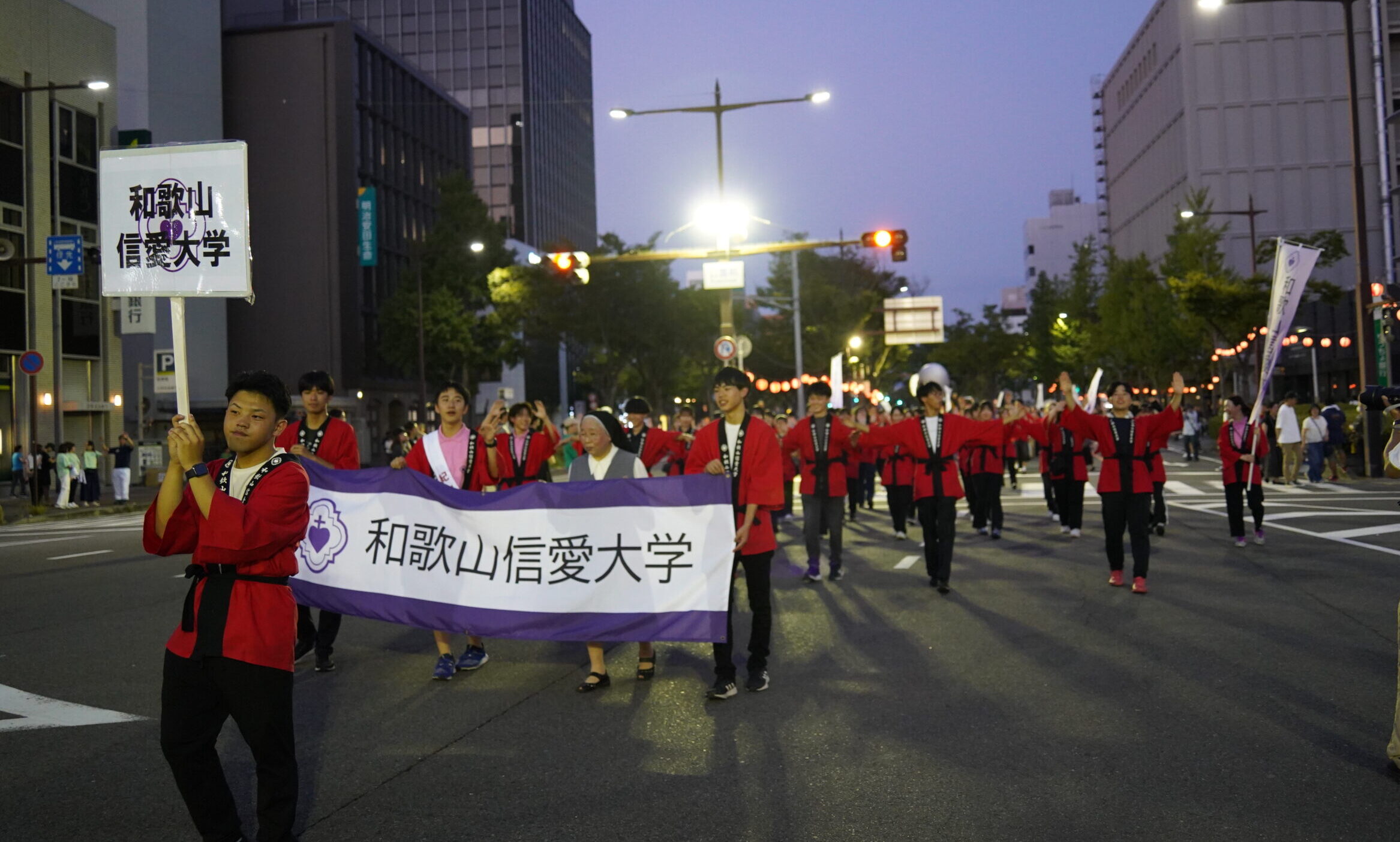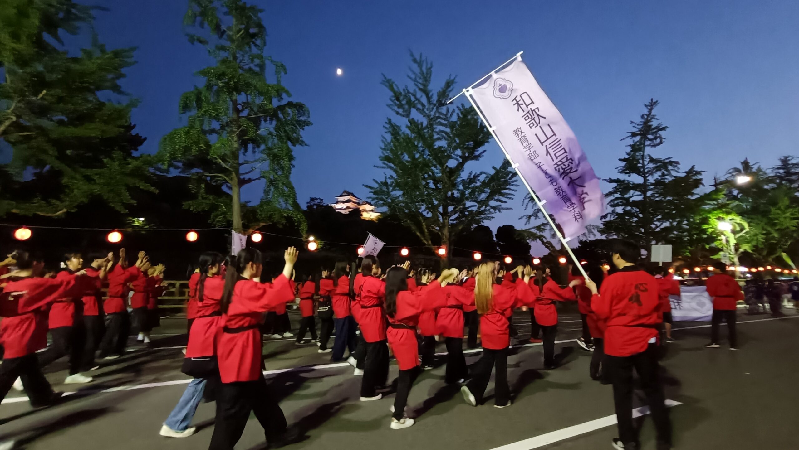 2025年8月2日(土)、本学1年生65名が、57回紀州おどりぶんだら節」に参加しました全員がおそろいの赤いはっぴに着替え、大学から会場まで歩いて向かいました。