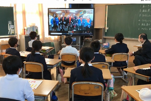 11月27日(金)紀の川市の麻生津小学校の3・4年生とオーストラリアのクレイトンノース小学校の3・4年生の国際交流活動をゲストティーチャーとして行いました。コロナ禍ではありますがビデオ会議システムを利用して行いました。日本側は、英語による自己紹介、日本の手遊び「とんとんとんとんひげ爺さん」の発表、「クッカバラ」の英語による合唱、オーストラリア側は、日本語による自己紹介、「きらきら星」の英語と日本語による合唱がありました。両校の子どもたちのキラキラと輝いた姿が印象的でした。