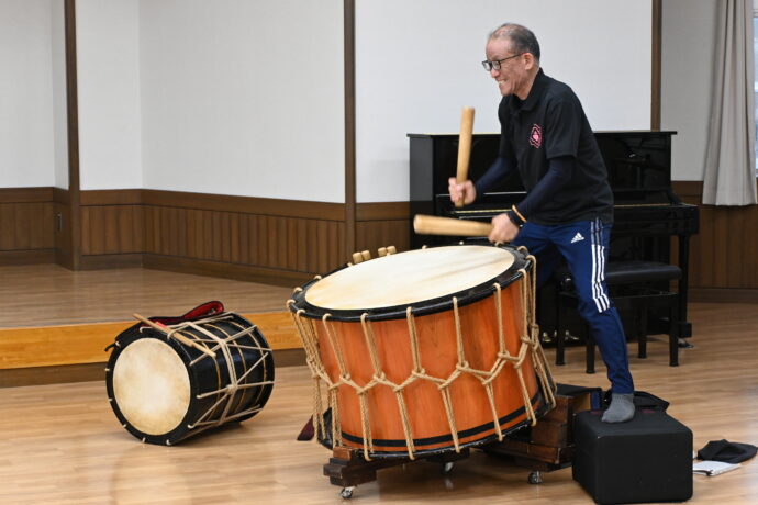 5月21日(水)、本学音楽室にて、原 啓司先生が元 ブルーハーツのドラム梶原 徹也さんとともに、パワフルな和太鼓の演奏を行いました。6月17日(火)には、海南市の 一灯舎 (海南市多田99)にて、元 鼓童の和太鼓奏者の坂本 雅幸さんとともにライブを行います。