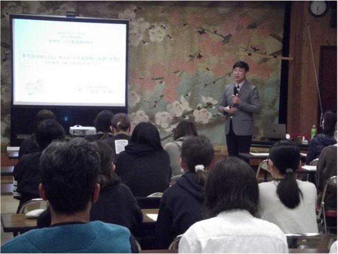 2023年11月17日(金)、原 康行准教授が、和歌山県みなべ町において、町内すべての保育士、保育教諭を対象に、「育児担当制とともに考える『幼児期前期の発達と保育』―3.4.5歳児とは違う、2歳児保育のあり方とは―」と題し講演を行いました。2歳児の発達を行動の視点から解き明かし、愛着を形成していく関わり方、環境構成、遊びの支援方法について具体的な事例を交じえ、お話しされました。グループワークでは、自園において、明日からの保育で何ができるのかを議論しました。
