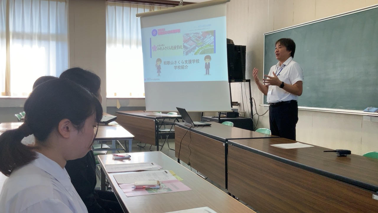 2024年9月26日(木)、「特別支援教育•保育Ⅱ(担当:原康行 准教授)」の学外講義として、3年幼保コース学生が「和歌山さくら支援学校溝端英二 校長)」を訪問しました。将来、担当する子どもたちの就学先の一つである「特別支援学校」の教育や指導・支援方法の実際を学びました。