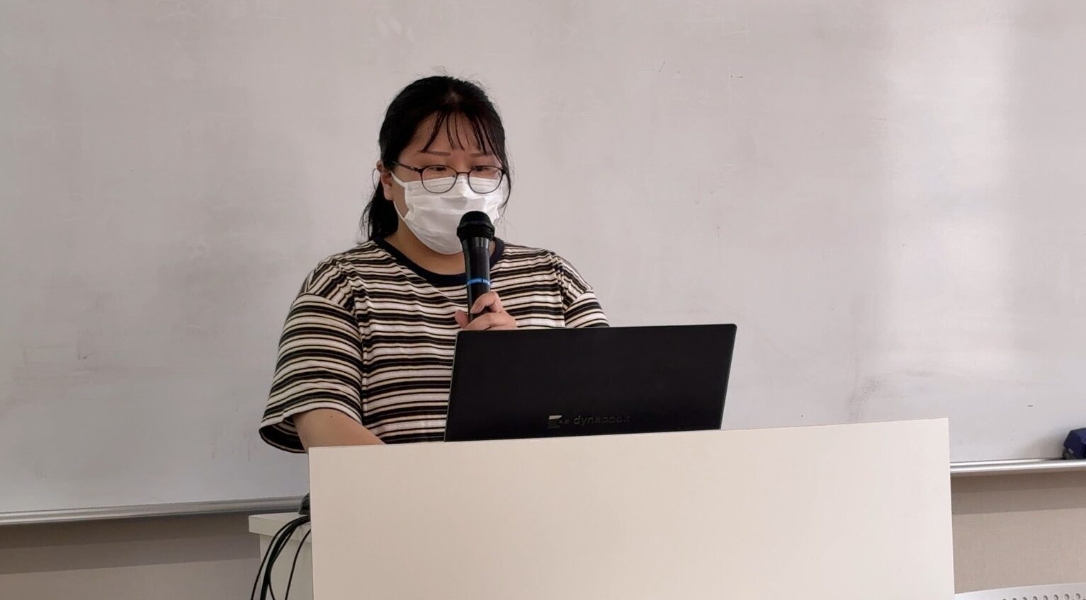 司会を務めた中野さんが「これまでの研究経過、成果を報告させていただきます。たくさんのご意見、ご指導をいただき、更に研究を良いものにしたいと思います。」と挨拶しました。指導には、元 本学准教授 八代健志先生、本学 前島美保 助教も加わり、それぞれの専門分野からご指導いただきました。「大学生の課題遂行における『意図-行動ギャップ』と自己効力感の関連」について研究を進める山本さんは、ヒトが行動を起こす前段階として「行動意図」があり、その段階から「行動」を生起させるかどうか、生起までにかかる時間には、その人の「自己効力感」が影響するのではないかと示しました。