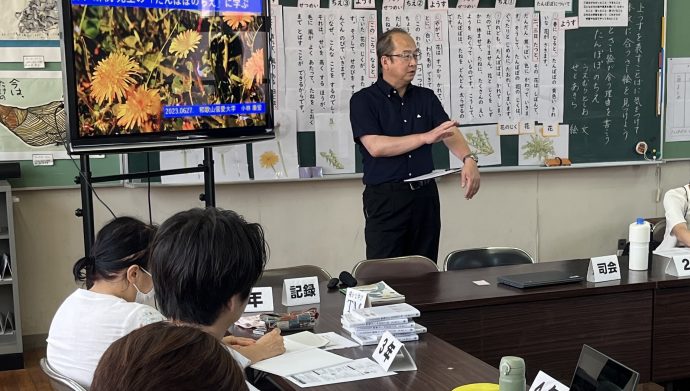 令和5年6月27日(火)、小林康宏教授が、大阪府最南端、かつ、最西端の岬町立多奈川小学校で、「たんぽぽのちえ」(光村2上)の研究授業に関する講話を行いました。授業では、子ども達は積極的に、教材文でたんぽぽの様子について書かれた箇所と挿絵との共通点を見付けていきました。