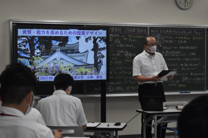 2022年6月30日(木)、小林康宏教授が、愛知教育大学附属岡崎小学校で、研究授業指導・助言、講話を行いました。「桃」(『飛ぶ教室No.65』)を教材にした6年生対象の研究授業の指導・助言を行うとともに、「資質・能力を高めるための授業デザイン」の演題で、講話を行いました。お互いの発言に耳と心を傾け合い、確かで、豊かな解釈を紡いでいく6年生の児童の皆さんの積極的、協働的な学びの姿が印象的でした。