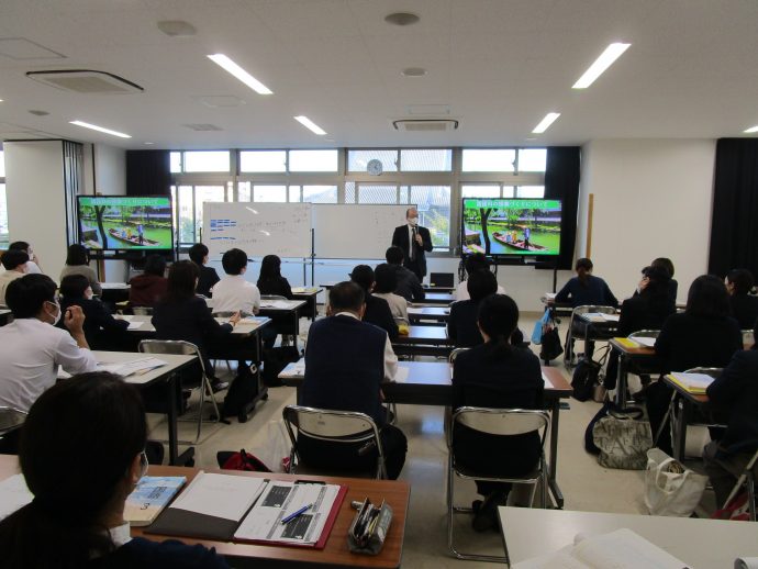 2022年11月2日(水)、小林康宏教授が、令和4年度指導力向上に係る研修(中学校国語 和歌山の部、共催:和歌山県教育委員会、和歌山市教育委員会、和歌山市中学校国語教育研究会)で、「国語科の授業づくりについて」をテーマに講義を行いました。会場は、中学校国語科の先生方の熱気に包まれていました。