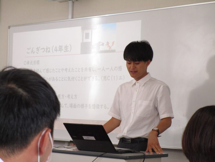 令和5年8月24日(木)、白浜町立白浜第二小学校の先生方が来学され、国語科の授業づくりの研修会を行いました。研修会前半では、まず、小林康宏教授による言葉による見方・考え方を育て、働かせる授業の基本についての講義・演習がありました。その後、「くじらぐも」(光村1下)「お手紙」(光村2下)「ごんぎつね」(光村4下)それぞれの研究授業で授業者を務める先生方から、単元展開、本時の展開についてのプレゼンがなされた後、小林康宏教授による助言がありました。研修会後半では、本学の学生からの質問に対して、白浜第二小学校の先生方からのお答えを頂きました。この研修会には、小林ゼミだけではなく、2年生からも複数の参加がありました。先生方の明るく、さわやかな姿から多くの学びを得ることができました。
