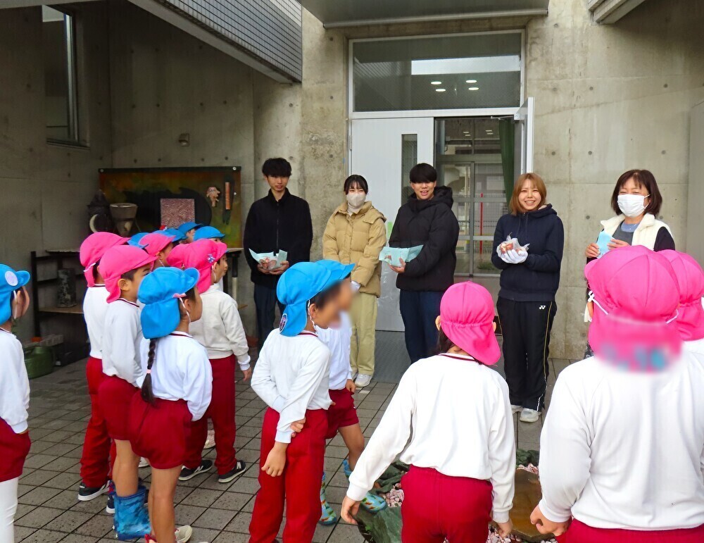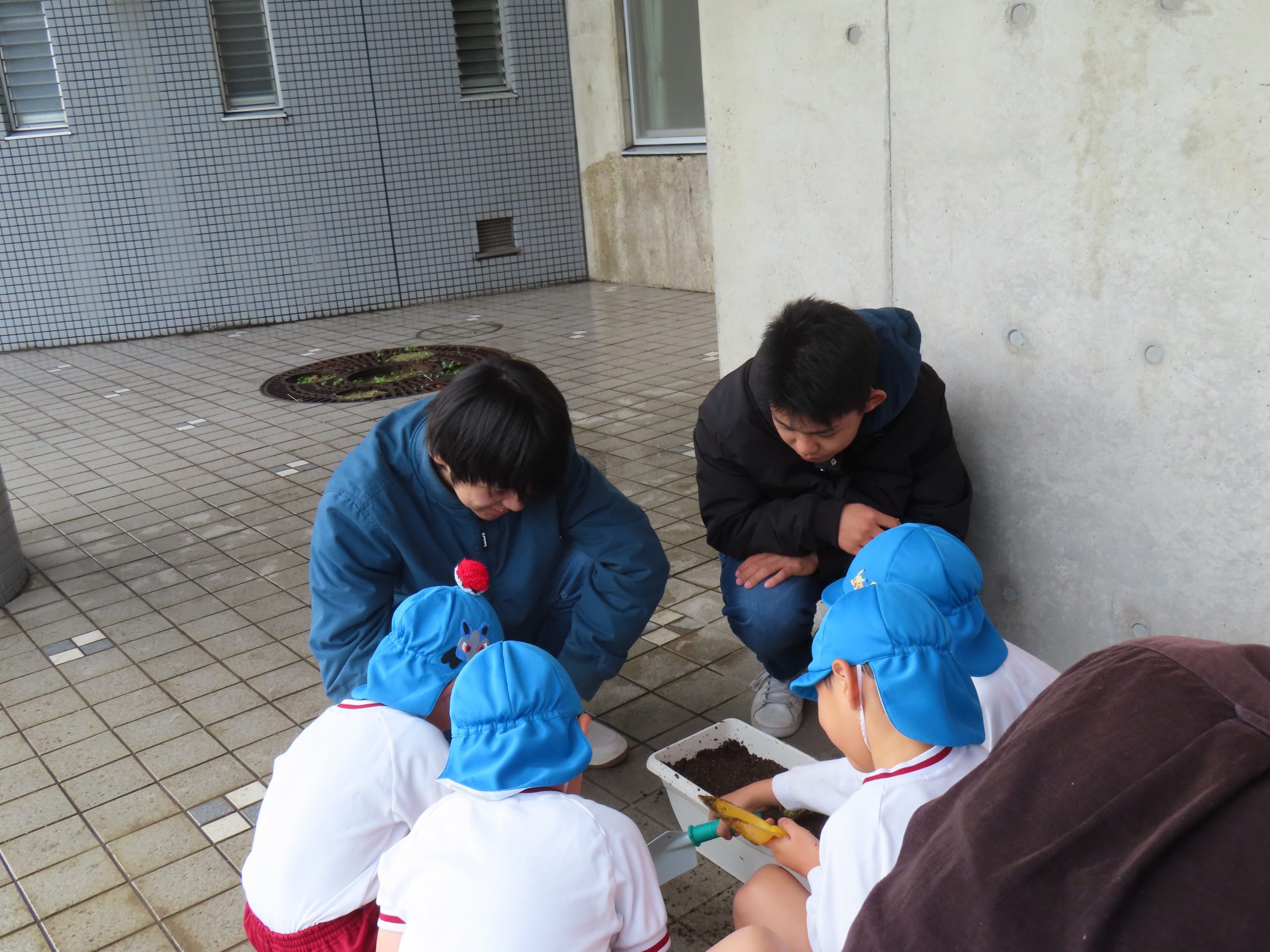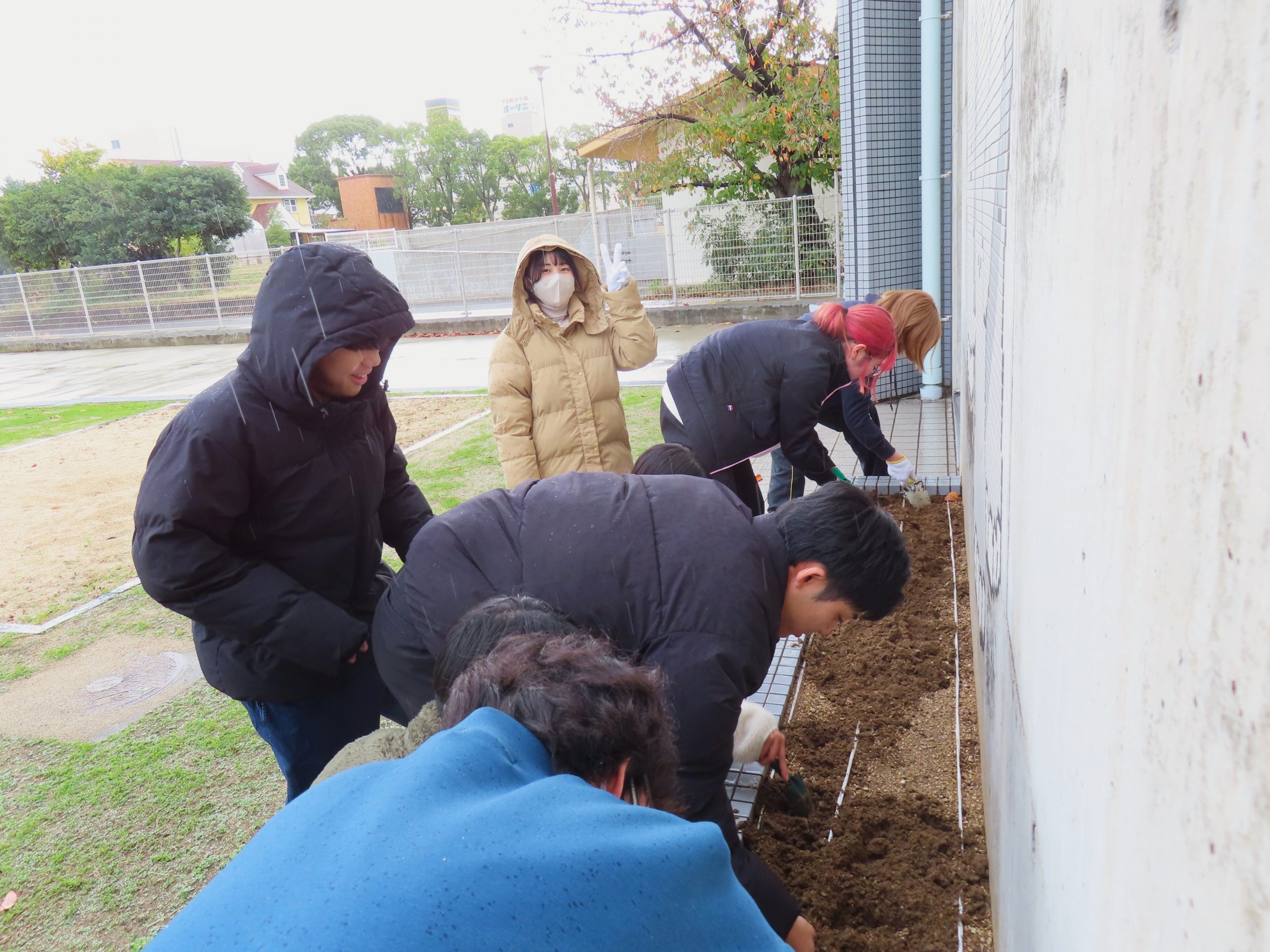 きょう育の和センターの「チューリップ100球」を咲かせようプロジェクトが始まっています!2023年11月13日(月)は、本学の3号館前に、本町こども園の年長児約30名と信愛大学生有志20名が一緒に、「教職員共済あむりんキャンペーン」で当選したチューリップの球根100球を植えました。当日はあいにくの天候でしたが、皆楽しみながらプランターに球根を植えていました。これからの成長が楽しみです。