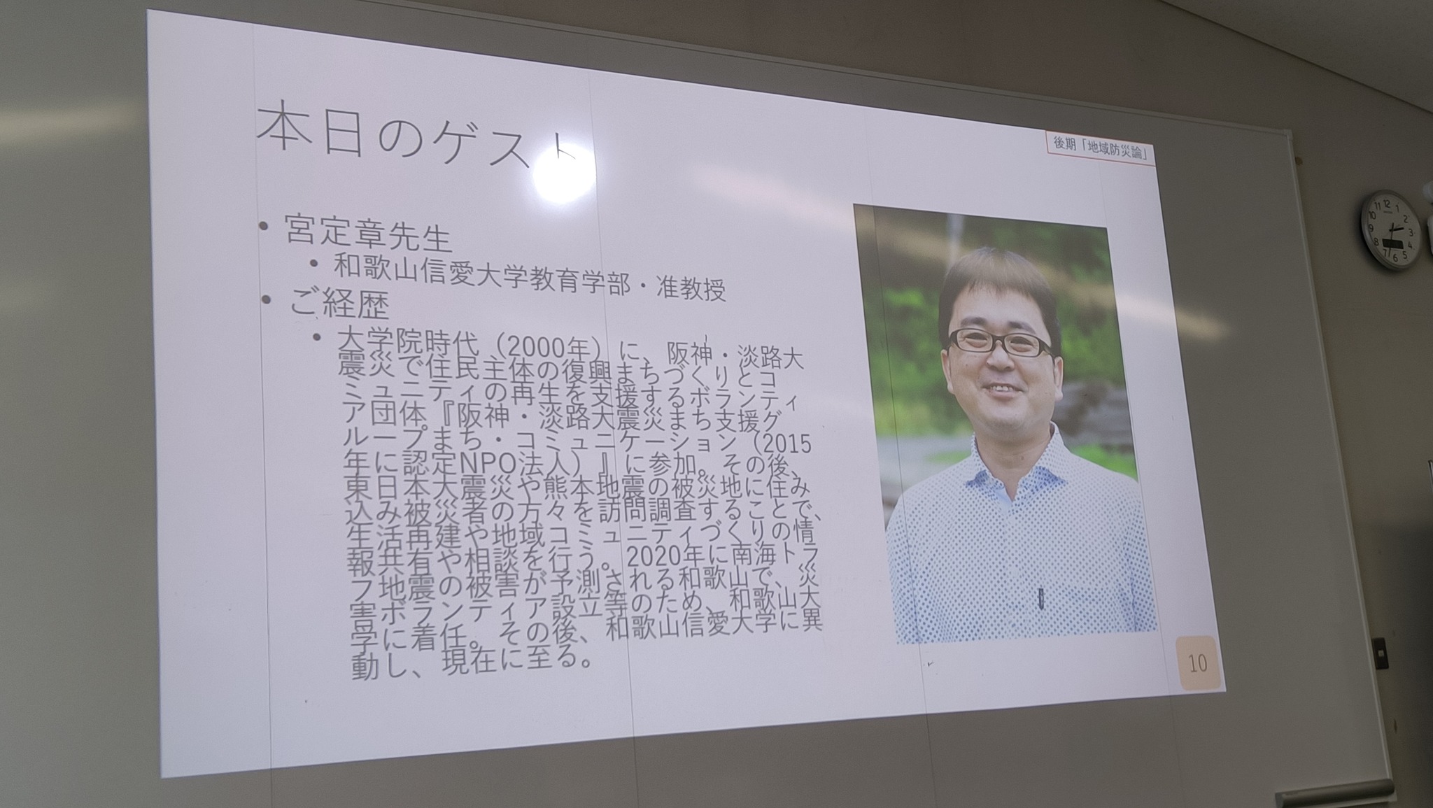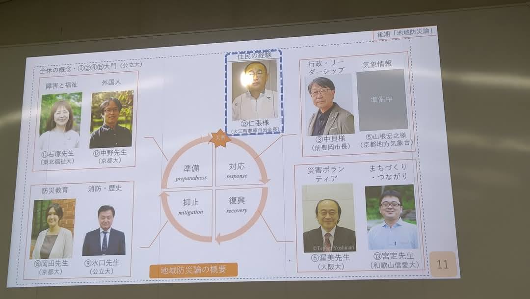 2025年1月10日(金)、宮定章准教授が福知山市にて「防災教育」をテーマに講演を行いました。福知山公立大学の講義「地域防災論」では、「災害後の復興まちづくり ~阪神・淡路大震災から30年の経験を活かした人と人とのつながりを焦点に~」をテーマに講義を実施し、市民向け公開講座「地域防災連続セミナー」では、「阪神・淡路大震災からの復興について」をテーマに講演を行いました。
