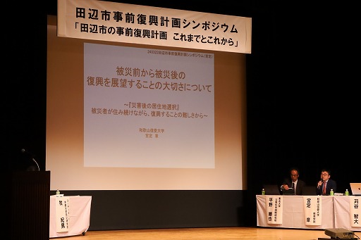 令和6年3月22日(金)田辺市の紀南文化会館 にて、災害からの復興を迅速に進めるための復興方針などをまとめる「事前復興計画」について考えるシンポジウムが開催されました。