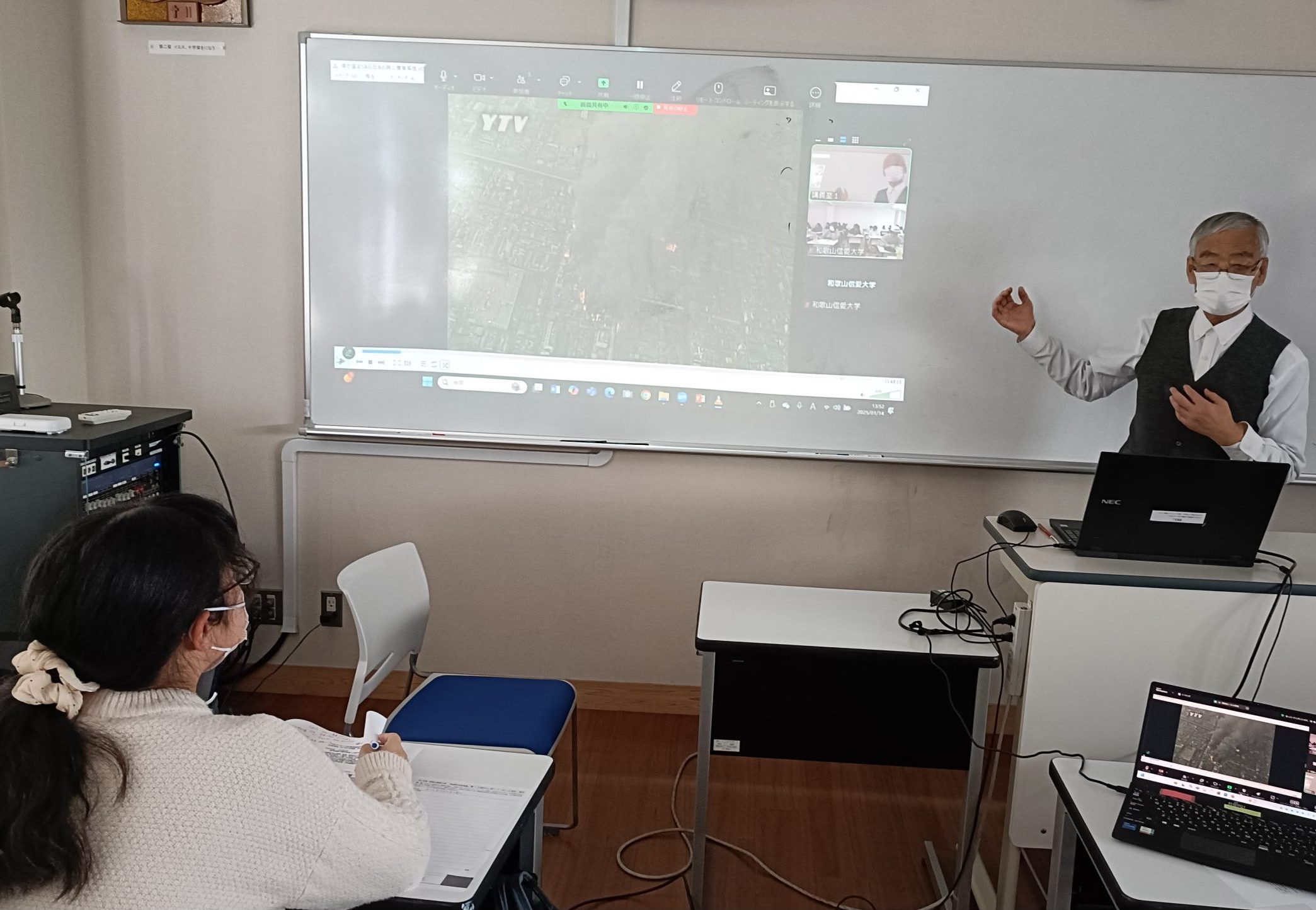 阪神・淡路大震災から30年。1996年4月より、教育復興担当教員として4年間尽力されました佐々木勉先生に、本学の地域防災教育論(3年生受講)にてご講義いただきました。佐々木先生をはじめ、教育復興担当教員は、担任を持たずに、全児童と向き合い、学校生活を支える役割を担われました。「初めての経験で、手探りの日々が続く中で、小学生は大人の笑顔を取り戻す力を持っている。地域に希望を与える児童を育てたい。」という想いで教育を行ったことや、児童らが学校の周囲を掃除したり、お年寄りの肩をたたいたりしていたこと等、様々な活動の経験や課題を教えていただきました。また、南海トラフ巨大地震 30年以内発生確率「80%程度」へと引き上げられた和歌山を中心に、地域で教員・保育士を目指す学生へメッセージをいただきました。