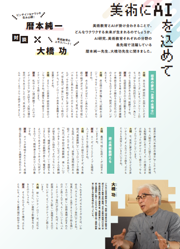 2023.11.02 教員紹介・メッセージ 大橋功教授が暦本純一教授と対談「美術にAIを込めて」 令和5年10月27日発行の日文教育資料[図画工作・美術]形formeに、和歌山信愛大学の大橋功教授と、東京大学の暦本純一教授(スマートフォン等を操作するマルチタッチ技術の発明者)との対談「美術にAIを込めて」が掲載されました。内容はコチラからお読みいただけます。また対談は下記QRコードより動画でもご覧になれます! 一覧に戻る