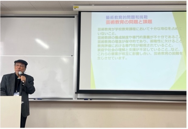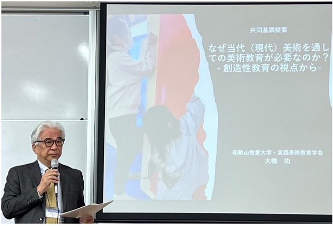 2025年2月2日(日)本学にて、第2回日台美術教育実践研究交流会が「創造性教育としての美術教育の課題と展望−日台の実践教育研究を通して−」をテーマに開催されました。台湾からの参加者9名を含めて北海道、滋賀県、兵庫県、大阪府、奈良県、そして和歌山県の各地から幼保、小、中、大学等多様な校種の教員、本学の学生など約60名が参加しました。冒頭に主催のわかやま子ども学総合研究センター長の大橋功教授と中華民国児童美術教育学会副理事長の呉正雄氏による共同基調提案が行われました。STEAM教育をはじめ、多様で不確実な時代において求められる創造性の育成という視点から美術教育・造形表現教育の現在を実践的に検討することの重要生が指摘され、とりわけ、作品の完成をめざし、その技量の巧拙を競うような古い美術教育を払拭し、「問い」を生み、その問いを創造的に探究する資質・能力としての創造性を育成する教育への転換について提案されました。