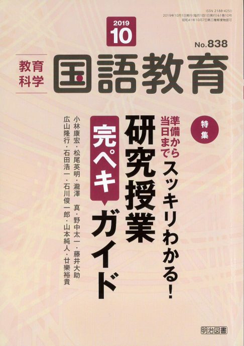 2019.10.04 研究者情報 「教育科学国語教育」に小林康宏教授の巻頭論文が掲載されました。 教育科学「国語教育」(2019年10月号・838号)の特集「準備から当日までスッキリわかる!研究授業完ペキガイド」に小林康宏教授の巻頭論文―「研究主任の心得」―が掲載されました。 一覧に戻る
