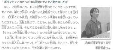 2025.08.07 地域連携 和歌山県人権啓発センターだよりに「大新こども食堂」での学生ボランティアの取り組みが掲載されました 『公益財団法人和歌山県人権啓発センターだより(E.L.F)エルフvol.93(2025年7月発行)』に、「大新こども食堂」での学生ボランティアの取り組みが掲載されました。2年生の地域連携フィールドゼミナールでの活動を契機に、3年生になった現在も継続してこども食堂の運営やイベント準備等のお手伝いをしています。誌面の学生インタビューからも、活き活きと活動している学生の様子が伝わってきます。ぜひ画像をクリックして全文をご覧ください。 一覧に戻る