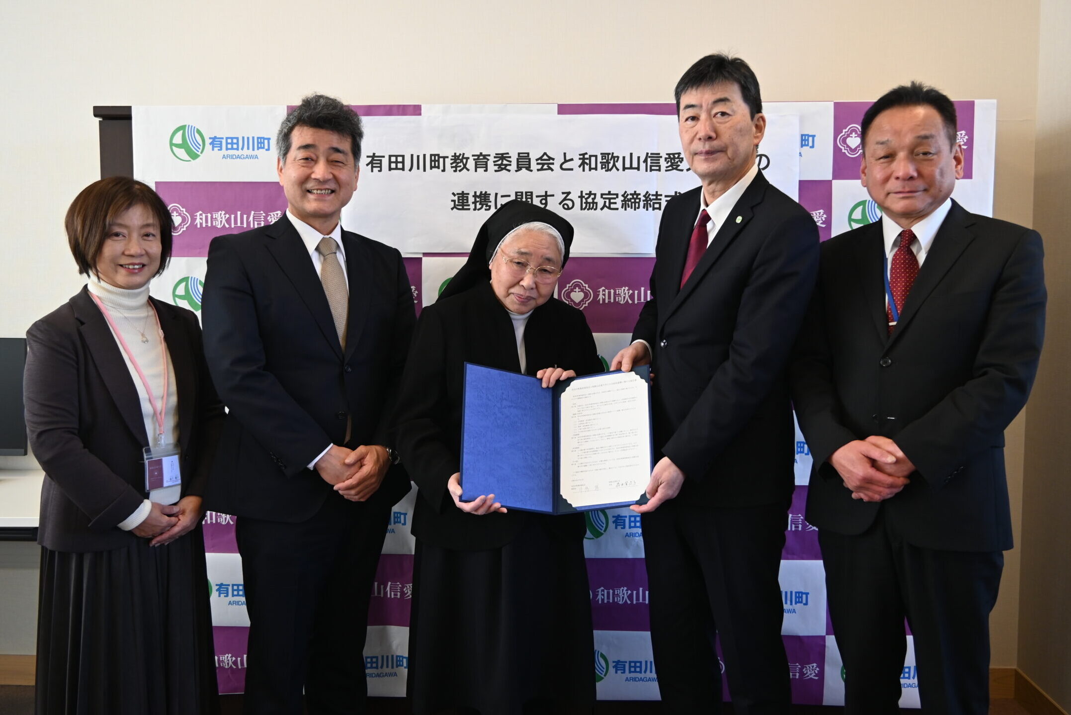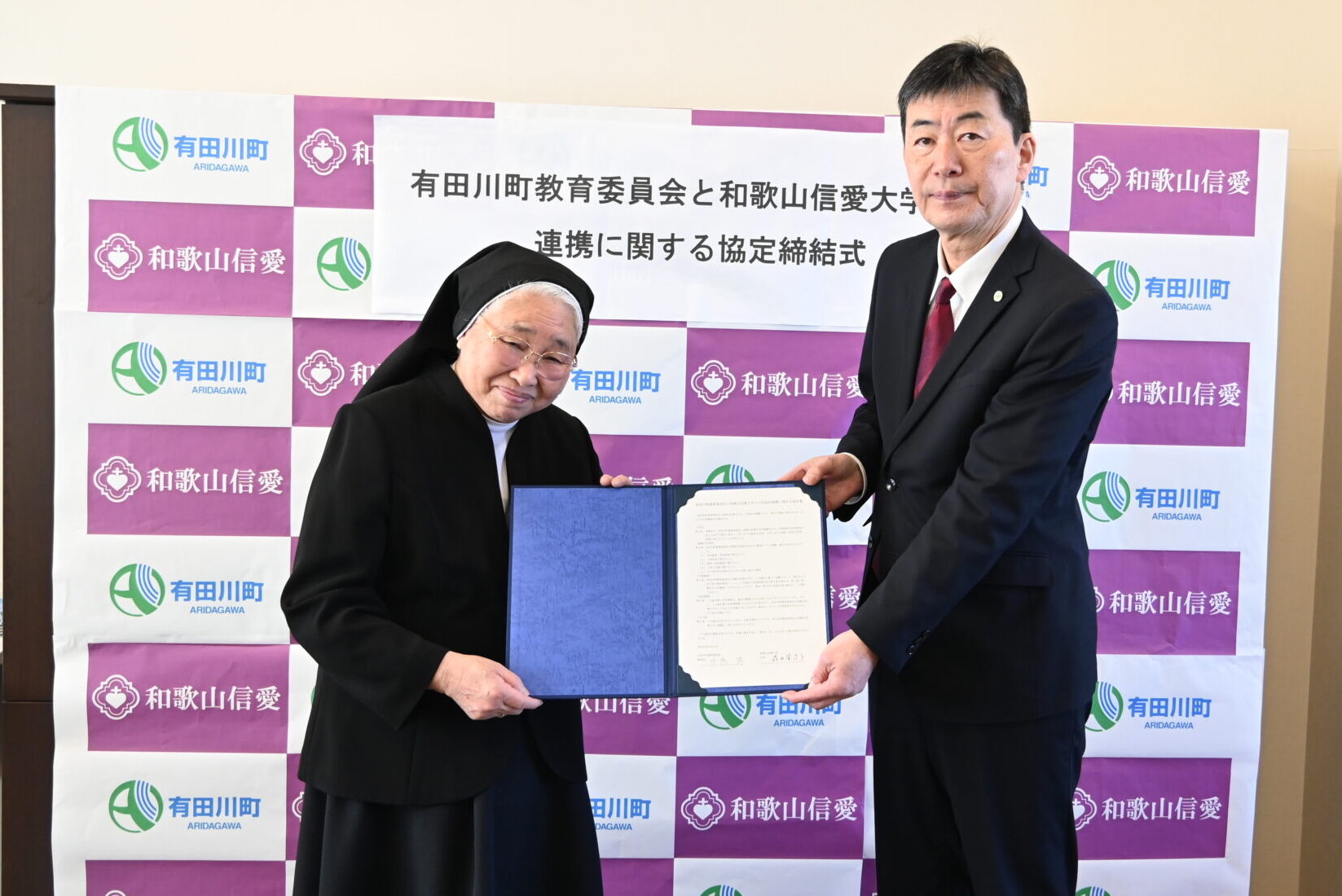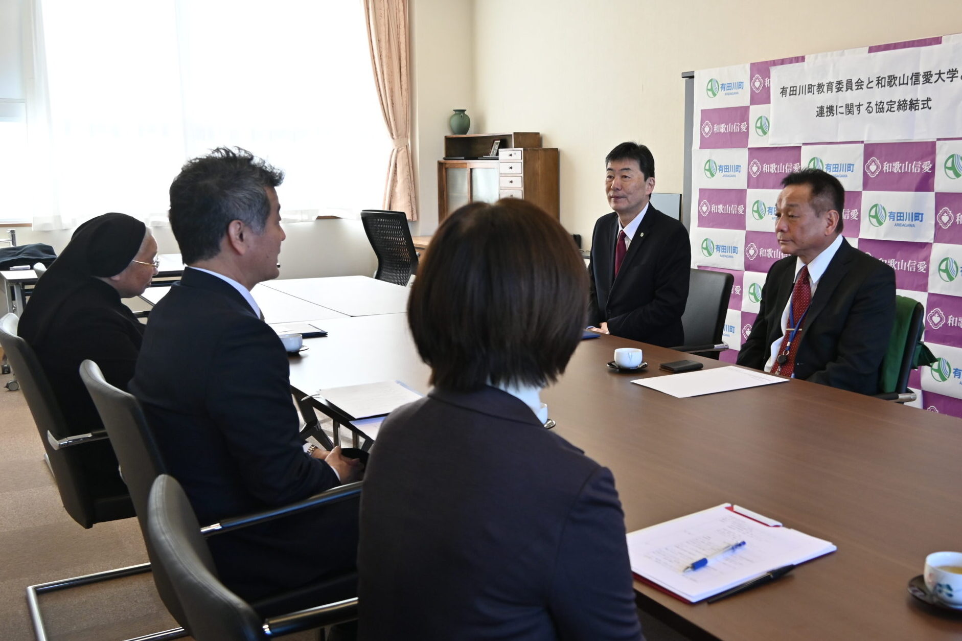 2026年2月3日(火)、有田川町教育委員会と和歌山信愛大学は、地域社会の発展と学術の振興に貢献することを目的に、包括的連携協定を締結しました。本学は、2023年に始まった「有田川町教育最先端化1000日プロジェクト保育力向上研修」の取り組みをはじめ、有田川町の地域の保育・教育の充実や、学生と町民の交流促進を進めるため様々な活動を協働実施しています。また、有田川町は、保育・教育従事者の待遇改善や、町内のこども園等で保育体験や交流を行う等、保育士・幼稚園教諭への関心を高め、職業自体の魅力を伝える取り組みを進めています。本締結式には、有田川町教育委員会より教育長の片嶋氏と、こども教育課指導主事の小切氏が来学し、今回の連携協定を契機として、より一層、学生と地域の方の交流を通した双方の学びの機会の充実に努め、保育・教育の充実に貢献することが話し合われました。