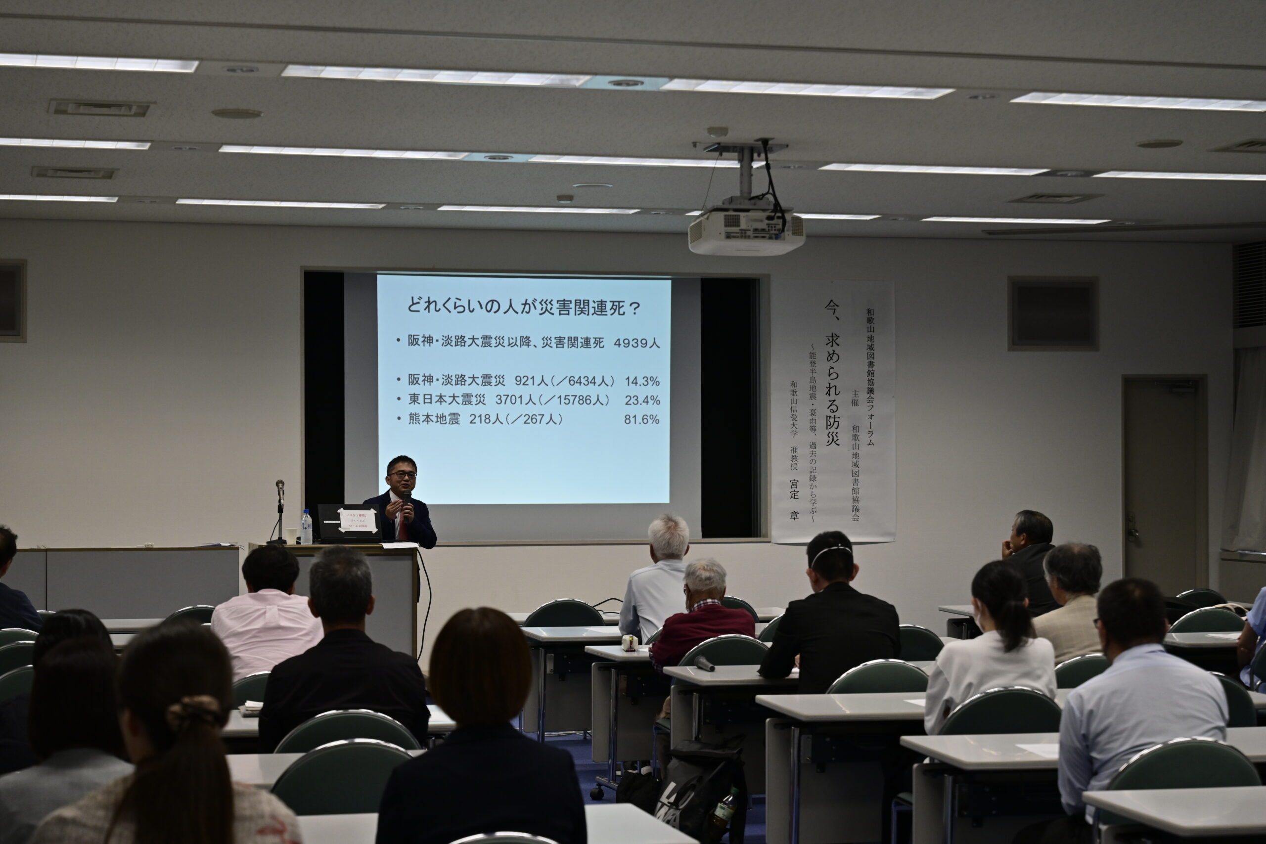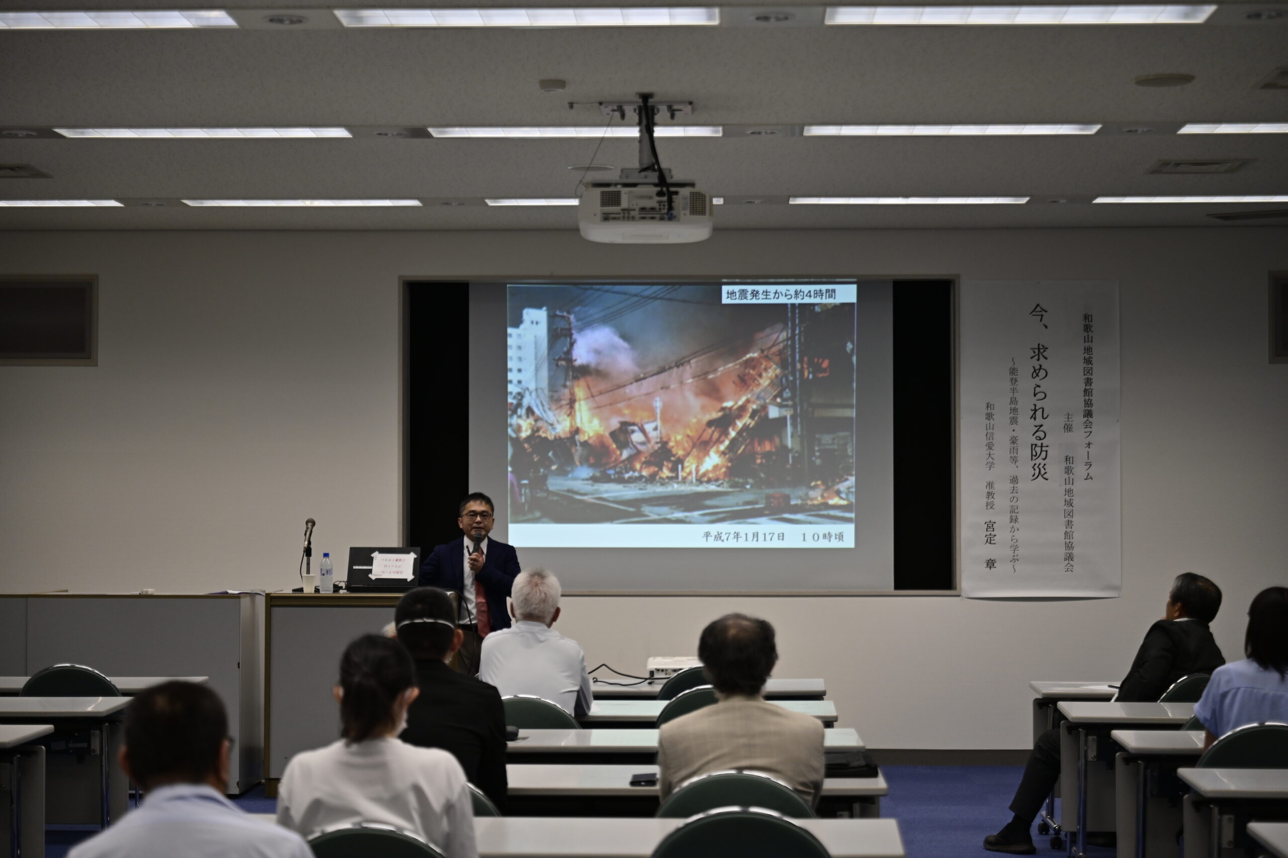 2025.10.02 図書館 2025年度和歌山地域図書館協議会フォーラムが開催されました 2025年9月27日(土)、和歌山県立図書館に於いて、宮定章准教授が「今、求められる防災~能登半島地震・豪雨等、過去の記録から学ぶ~」をテーマに講演を行いました。阪神・淡路大震災の実体験から、昨年の能登半島地震・豪雨までの問題提起、海外(イタリア)での防災事例などを紹介しました。講演後は聴講者との質疑応答が活発に行われました。 一覧に戻る