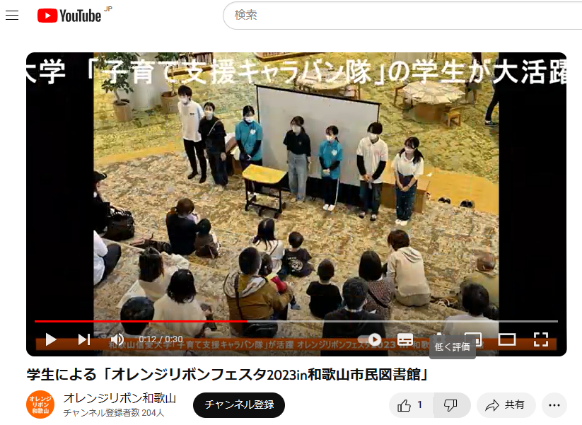 令和5年10月29日(日)に子育て支援キャラバン隊の学生たちが参加した、「オレンジリボンフェスタ2023in和歌山市民図書館 みんなで飾ろう!オレンジリボンツリー」での活動がYouTubeで公開されています。ぜひご覧ください!動画は下の画像から。