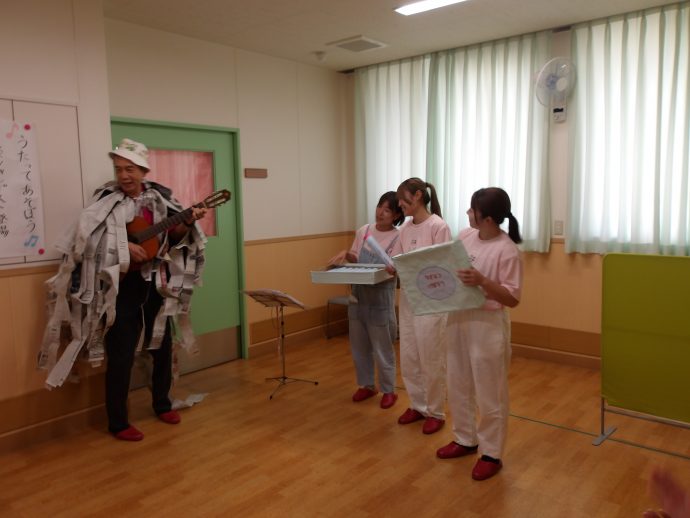2024年9月14日(土)八代健志准教授が福祉型児童発達支援センター保育所等訪問支援事業所カナの家にて、子どもお楽しみ会として「音楽プログラム」を行いました。音楽プログラムでは、『新聞爺』が現れ、ギター1本でいろんな音楽を奏でました。本学学生も参加し、子どもたちの楽しい音楽活動のサポートをしました。