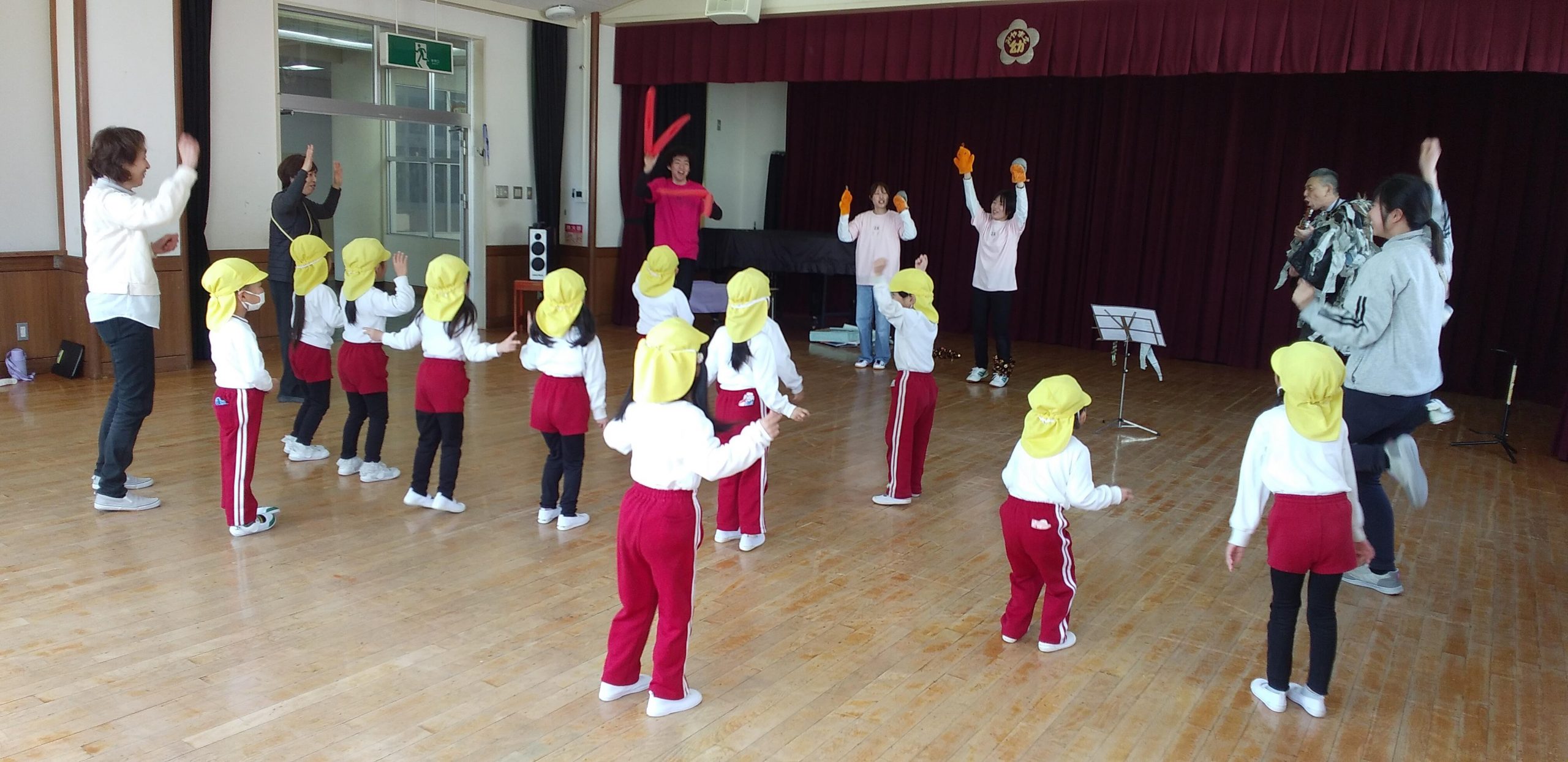 子どもたちは、だるまフレンズと一緒に「かめのえんそく」「だるまさんシアター」「エビカニクスダンス」「ハーモニカ演奏」「どんな色が好き」と心とからだをめいっぱい動かし、楽しみました。「しんぶんじぃ、また明日も来てね〜。」「しんぶんじぃ、げんきでね。」と名残惜しい気持ちがこぼれていました。